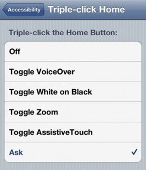 Trước tiên, hãy vào Settings, General, Accessibility, sau đó cuộn xuống phía dưới cho đến nhãn “Triple-click Home”. Thông thường, nhãn này hay bị mặc định “Off”. Giờ hãy phiêu lưu một tí, nhấn sang “On”, để kích hoạt các tính năng mới khi bạn bấm 3 lần vào phím Home.