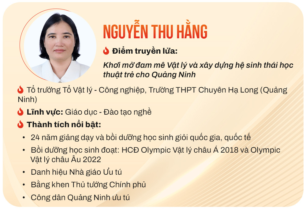 Ở Trường THPT Chuyên Hạ Long (Quảng Ninh), cô giáo Nguyễn Thu Hằng là biểu tượng của lòng yêu nghề, của sự tận tụy và bền bỉ suốt 24 năm gắn bó với giáo dục mũi nhọn. Là giáo viên và Tổ trưởng Tổ Vật lý - Công nghiệp, cô Hằng trực tiếp huấn luyện đội tuyển học sinh giỏi quốc gia và quốc tế, góp phần đưa Quảng Ninh trở thành điểm sáng trên bản đồ Vật lý của Việt Nam.