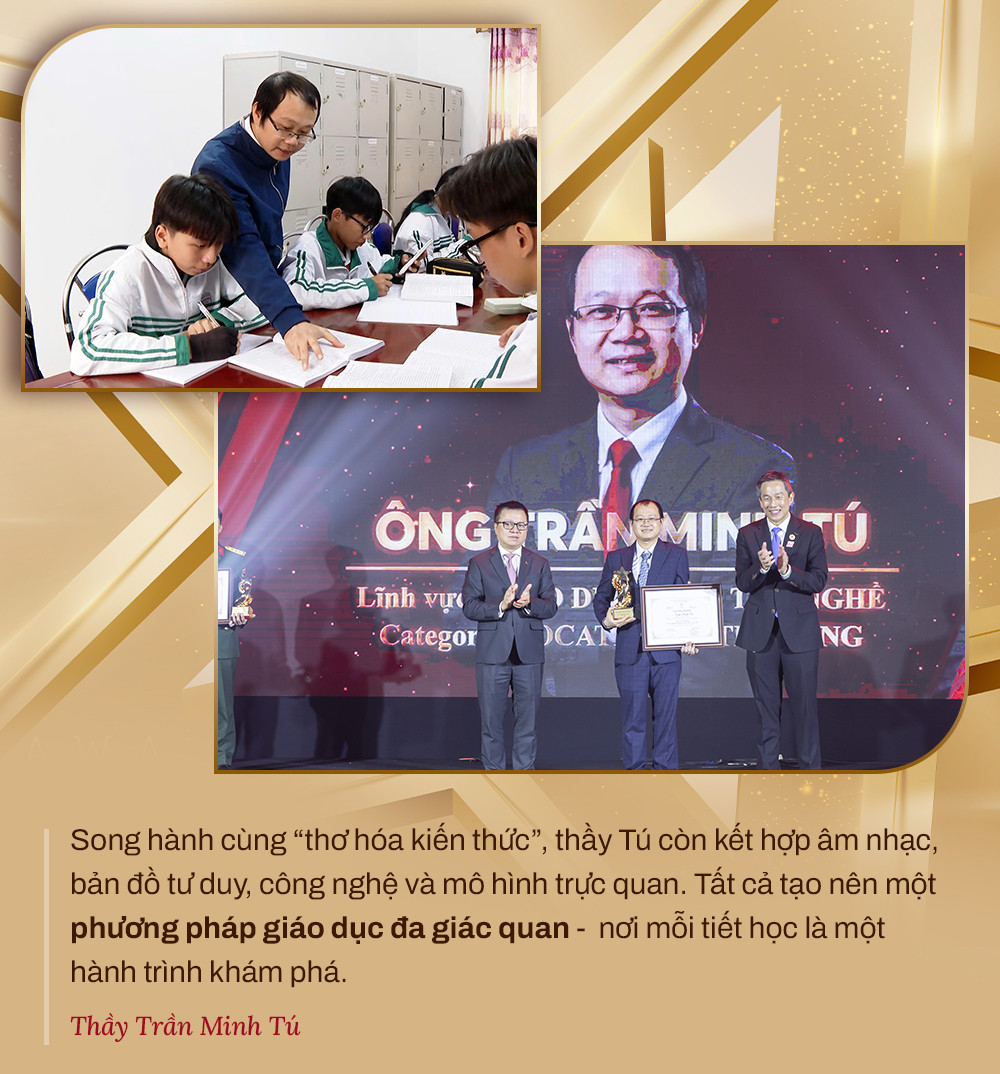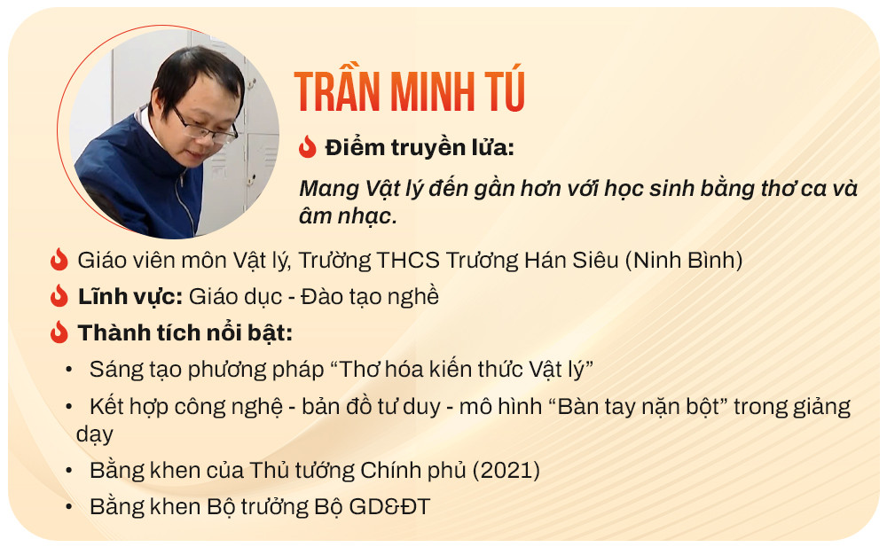 Vượt qua khuyết tật bẩm sinh ở cánh tay trái, thầy Trần Minh Tú, giáo viên Vật lý Trường THCS Trương Hán Siêu (Ninh Bình), đã chứng minh rằng giới hạn là để vượt qua. Thầy lựa chọn cách tiếp cận đầy sáng tạo: Biến kiến thức Vật lý thành thơ, giúp học sinh ghi nhớ nhanh, hiểu sâu và yêu thích môn học hơn.