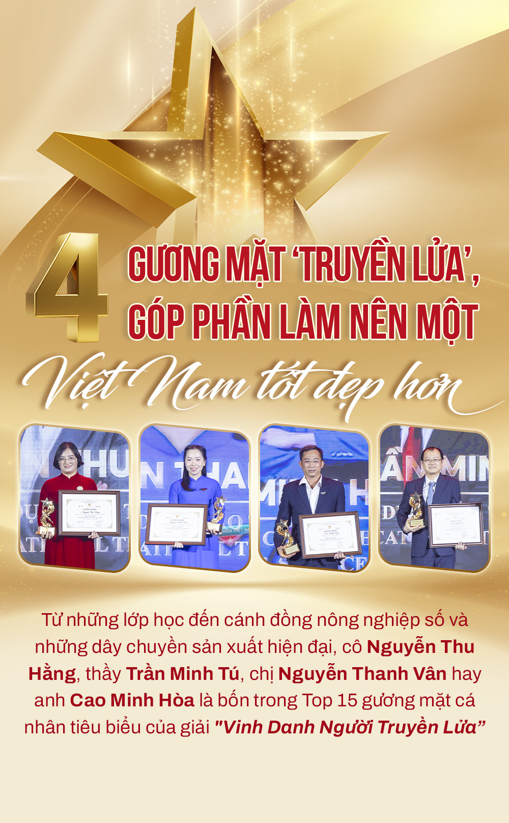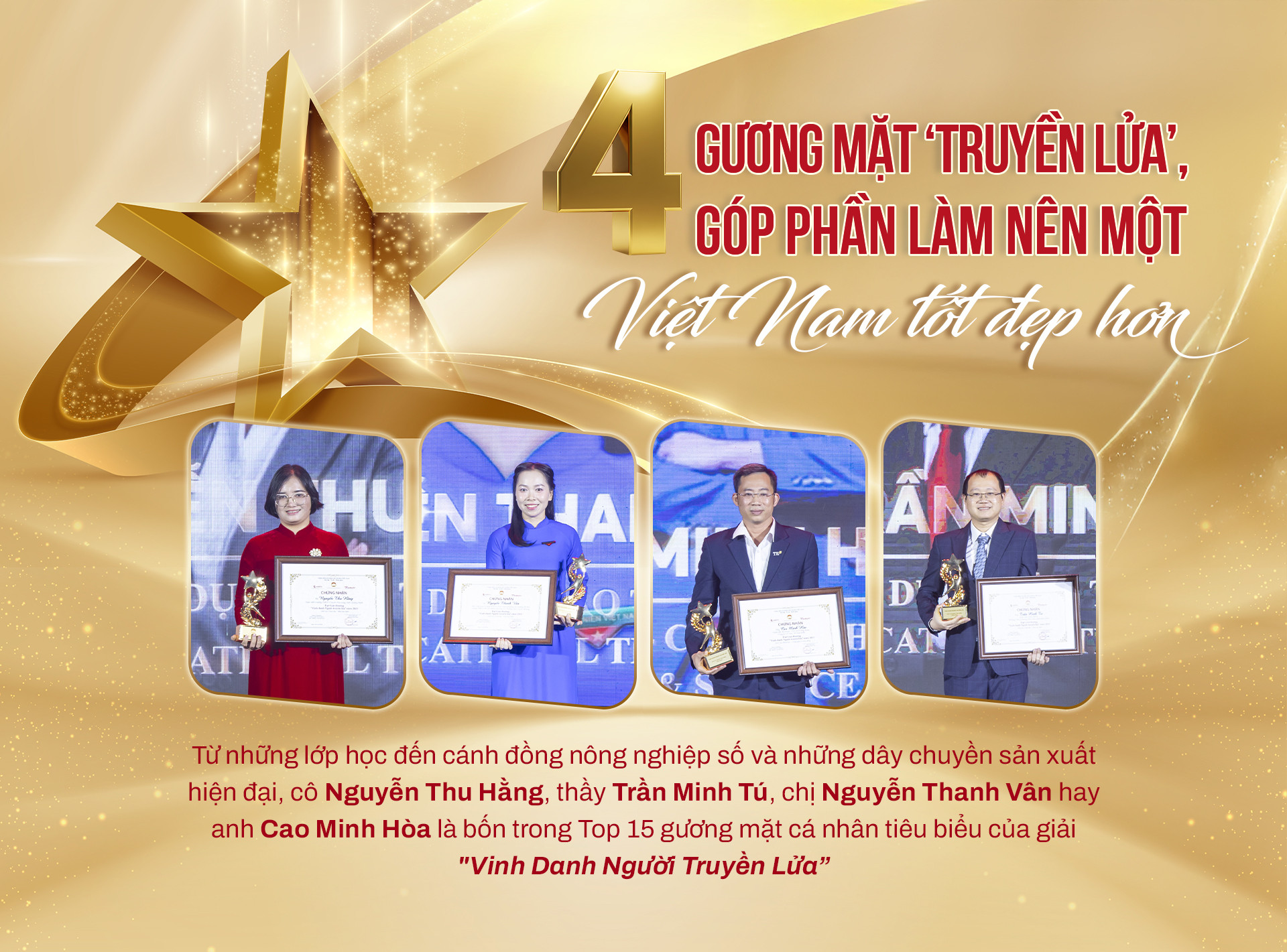 Trong số 15 gương mặt được vinh danh, bốn nhân vật này đại diện cho những tấm gương ngày đêm thầm lặng tạo ra những sáng kiến về giáo dục, chuyển đổi số cho bà con nông dân và những sáng kiến kỹ thuật, tất cả từng ngày tạo nên những hiệu quả trong chính lĩnh vực công tác của mình.