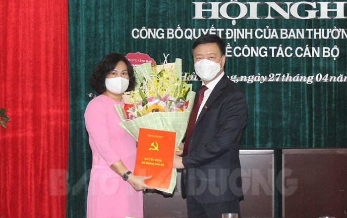 Phó Bí thư Thường trực Tỉnh ủy Hải Dương Phạm Xuân Thăng trao quyết định và chúc mừng bà Ngô Thị Thanh Hòa |