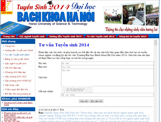Với mong muốn hỗ trợ các em học sinh chuẩn bị đăng ký thi vào Đại học Bách khoa Hà Nội có đầy đủ các thông tin về phương thức tuyển sinh và hệ thống giáo dục đào tạo của trường, song song với kế hoạch mở hệ thống đăng ký sơ tuyển, kể từ ngày 24/2/2014, Phòng Đào tạo Đại học của Đại học Bách Khoa Hà Nội triển khai chương trình Tư vấn trực tuyến tuyển sinh 2014 trên trang web tuyển sinh của trường tại địa chỉ: http://ts.hust.edu.vn. Câu hỏi của các thí sinh và phụ huynh sẽ được Ban tư vấn tổng hợp và trả lời ngay trong ngày.