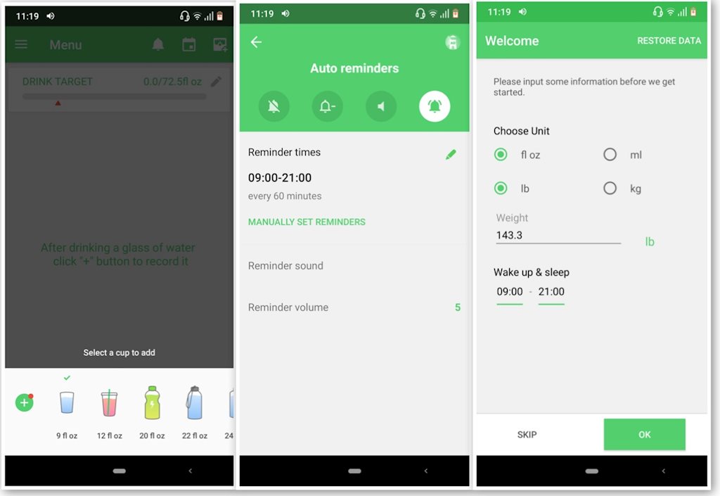 Ứng dụng cung cấp biểu đồ theo dõi quá trình cung cấp nước cho cơ thể, cho phép thiết lập thời gian bắt đầu và kết thúc uống nước mọi ngày để thực hiện nhắc nhở. Water Drink Reminder cho phép người dùng đăng nhập bằng tài khoản Google, hỗ trợ đồng bộ dữ liệu với Google Fit và Samsung S Health.