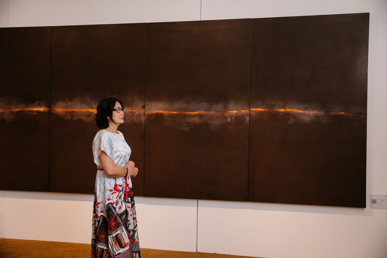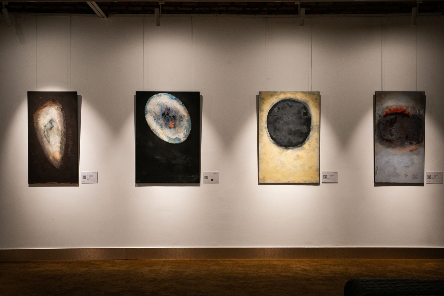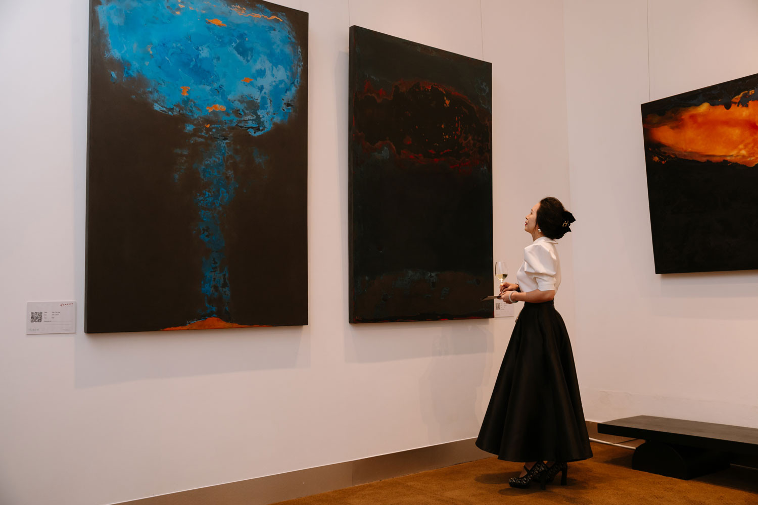 Bước vào gian phòng trưng bày, người thưởng lãm được bao quanh bởi hai bức tranh tứ bình: Thiên khải, Thiên không. Tuy đều xuất hiện dải sáng chạy ngang phần phía dưới của mỗi bức, trong khi Thiên khải bật lên tựa hồ các vệt đen đang bốc cháy rừng rực giữa vầng thái dương thì Thiên không lại leo lét như ánh dương của buổi hoàng hôn đang vụt tắt nơi cuối chân trời.