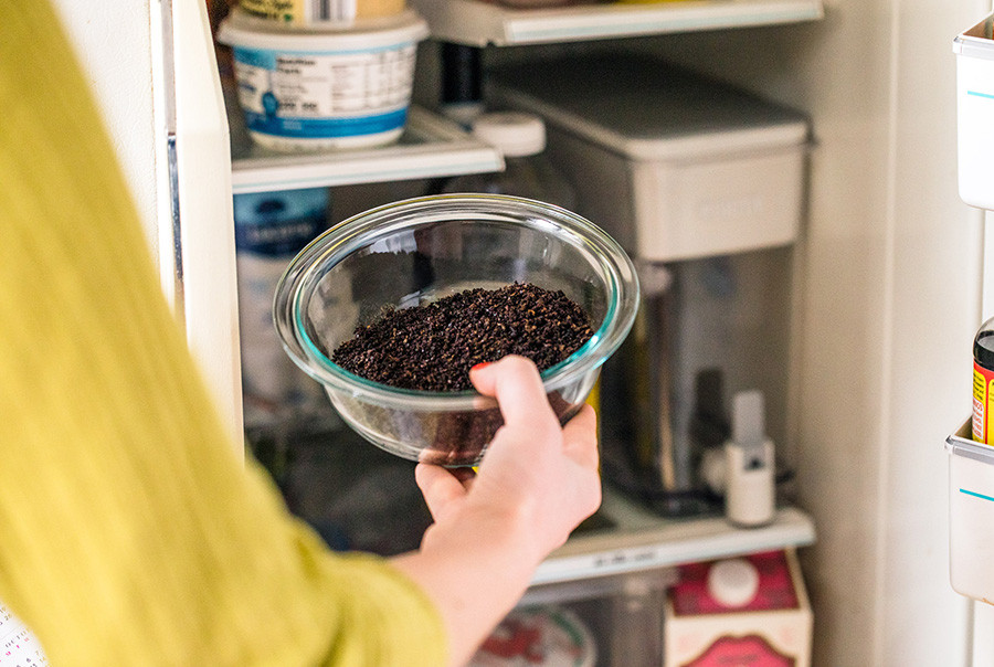 Khi tủ lạnh có mùi như vậy, gia chủ có thể dủng bã cà phê để khử mùi. Nicola Rodriguez cho biết, trong bã cà phê có chứa nitơ, phản ứng với cacbon để hấp thụ và khử mùi hôi. Gia chủ chỉ cần cho bã cà phê vào cốc hoặc bát rồi đặt vào tủ lạnh để khử mùi hôi. Nhưng phải đảm bảo bã cà phê phải khô hoàn toàn, nếu không chúng có thể bị mốc.