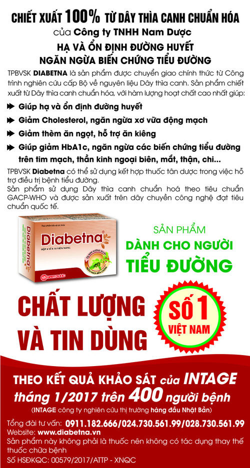 Người bệnh có thể sử dụng thêm các sản phẩm hỗ trợ điều trị tiểu đường để hạ và ổn định đường huyết, ngăn ngừa biến chứng của bệnh tiểu đường, và phòng ngừa đột quỵ như sản phẩm chiết xuất từ Dây thìa canh chuẩn hóa do công ty Nam Dược sản xuất - sản phẩm Diabetna.