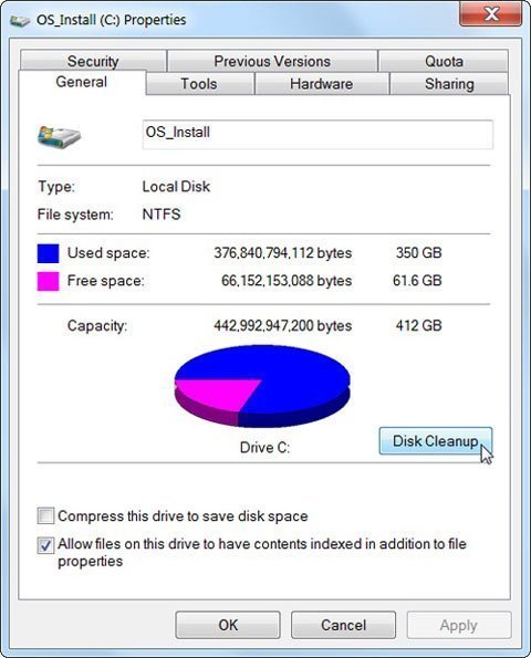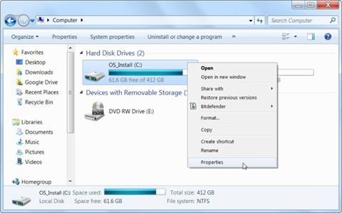 Windows có một công cụ tích hợp sẵn có chức năng xóa các file tạm thời (temporary file) và những dữ liệu không quan trọng khác. Để truy cập công cụ này, nhấn chuột phải vào ổ địa cứng trên cửa sổ Computer và chọn Properties.