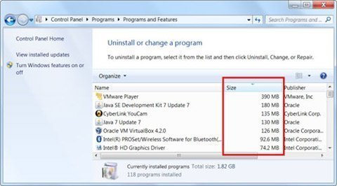 Bạn có thể xem mỗi ứng dụng cài trên máy chiếm bao nhiêu dung lượng ổ cứng bằng cách mở Control Panel/ Program/ Programs and Features, sau đó nhấn vào cột “Size”.