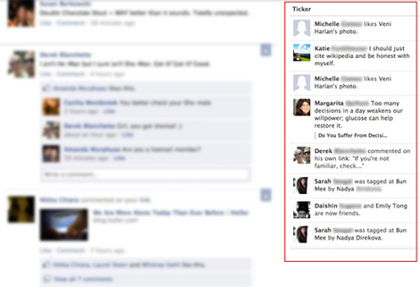 Dường như ông trùm mạng xã hội hơi quá tay trong việc bám sát người dùng, khi Ticker Home (bố trí cột bên phải, phía trên khung trò chuyện) tự động cập nhật quá nhiều chuyện riêng tư của bàn dân thiên hạ. Từ chuyện ai đăng ảnh lên tường ai, ai chia sẻ đường link cho ai đến chuyện ai nhấn “like” status của ai… tất cả đều được “tick” (dán) lên bởi Facebook.