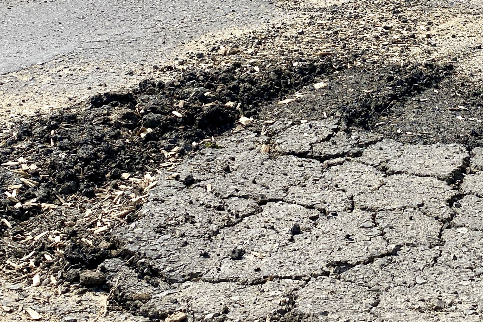 Mặt đường nứt nẻ nghiêm trọng. Ảnh: Diễm Phúc.