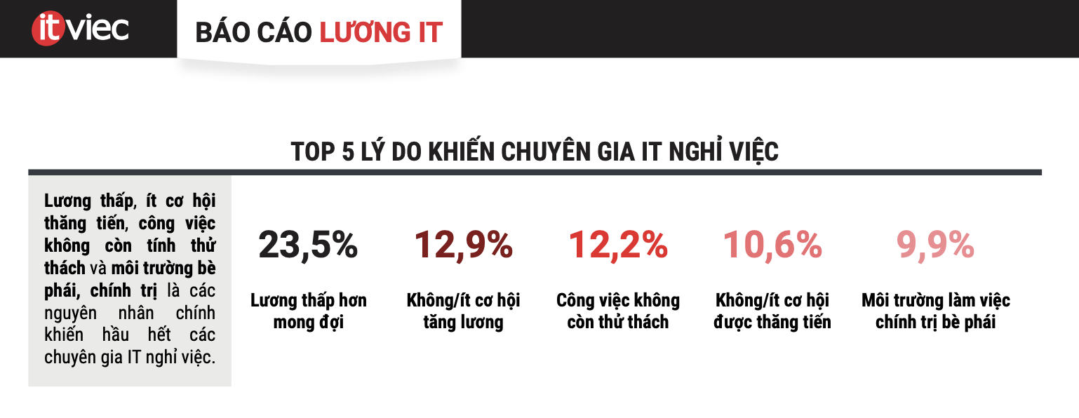 Có đến 23,5% chuyên gia IT tại Việt Nam tham gia báo cáo của ITviec cho biết “lương thấp hơn mong đợi” là nguyên nhân chính dẫn đến quyết định nghỉ việc ở một công ty. Một nguyên nhân khác khiến chuyên gia IT phải “dứt áo ra đi” khỏi công ty cũng liên quan đến mức lương là “không/ít cơ hội tăng lương” (12,9%).