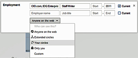 Nếu bạn chỉ muốn thông tin nghề nghiệp hiển thị với những người trong circle Friends, ví dụ, truy cập trang profile và chọn Edit Profile ở trên cùng. Kích vào mục bạn muốn chỉnh sửa, sau đó chọn menu drop-down "Anyone on the web".
