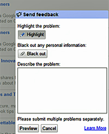 Khi hoàn thành, kích vào nút Preview để xem bản báo cáo bạn sắp gửi. Công cụ feedback này sẽ thu thập địa chỉ URL và tiêu đề của trang bạn đang truy cập, trình duyệt và hệ điều hành bạn đang sử dụng, cũng như bất kì tiện ích mở rộng nào bạn đang sử dụng. Nó còn thu thập cấu trích HTML của trang và địa chỉ email của bạn.