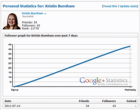 Được tạo bởi người đồng sáng lập ra trang hiện trạng Twitter Counter, Google+ Statistics theo dõi top 100 người dùng Google+ (quyết định bởi có bao nhiêu người theo họ) và cho phép bạn theo dõi các thông số riêng của mình, ví như có bao nhiêu người đã thêm bạn vào circle của họ, khả năng tiến triển của bạn và vị trí xếp hạng trong danh sách người dùng phổ biến của Google+.