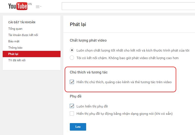 Trong cột bên trái, chọn "Phát lại" (playback) và dưới mục "Chú thích và Tương tác" (Annotations and interactivity), bỏ dấu chọn ở dòng "Hiển thị chú thích, quảng cáo kênh và thẻ tương tác trên video" rồi bấm vào nút "Lưu".
