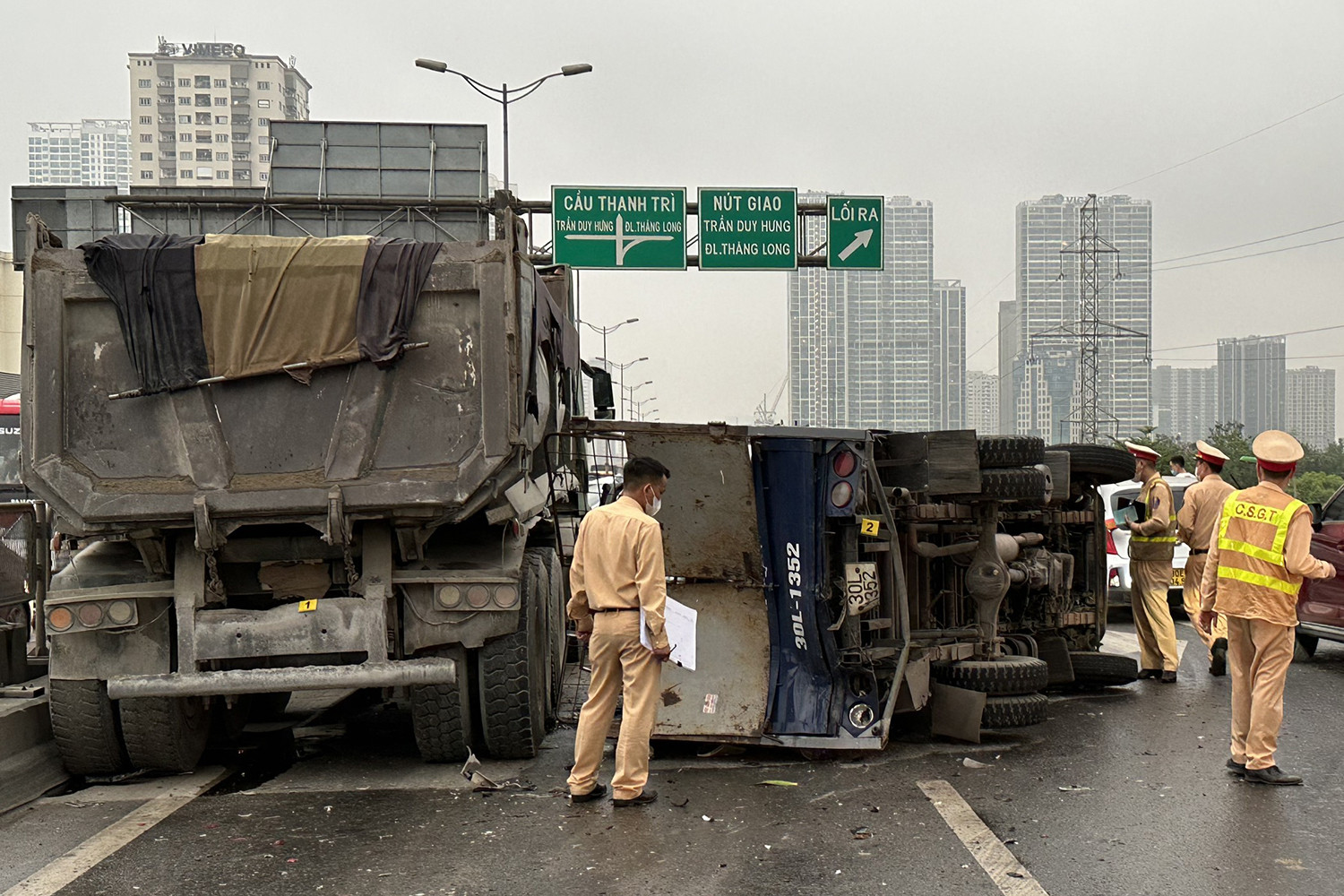 Vụ tai nạn khiến đường vành đai 3 trên cao, hướng từ Mai Dịch - Pháp Vân ùn tắc kéo dài. Lực lượng chức năng tại đầu tuyến và các nút giao phía Cầu Giấy phải phân luồng xe cộ đi xuống đường vành đai 3 dưới thấp.