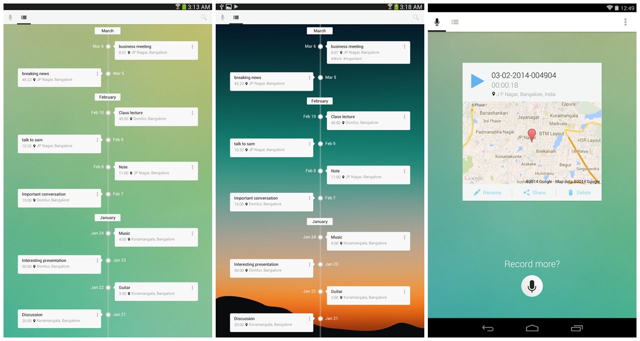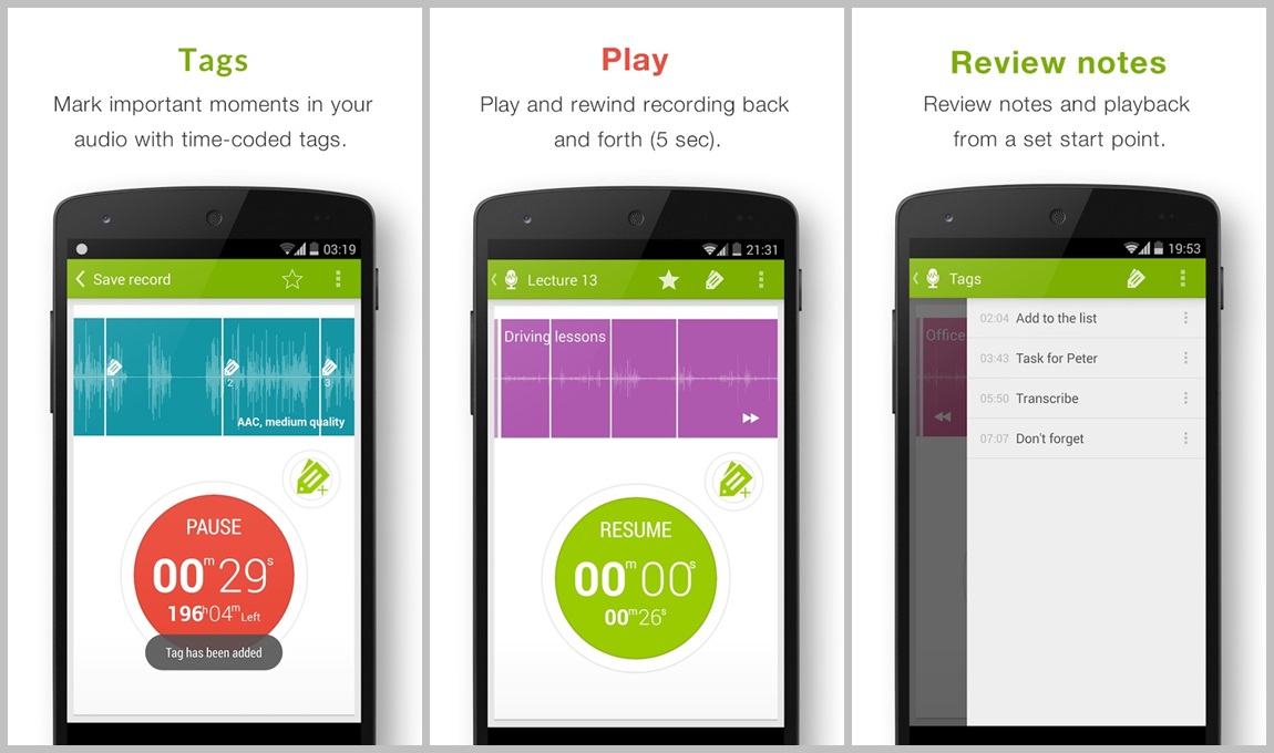 Với Recordense Voice Recorder, bạn có thể đánh dấu các đoạn ghi âm bằng màu sắc để dễ dàng nhận ra. Ứng dụng cho phép chọn chất lượng âm thanh (cao, trung bình, thấp), hỗ trợ thẻ nhớ, cho phép đồng bộ các file ghi âm trên nhiều thiết bị với Google Drive, điều khiển chương trình ghi âm từ thanh thông báo.
