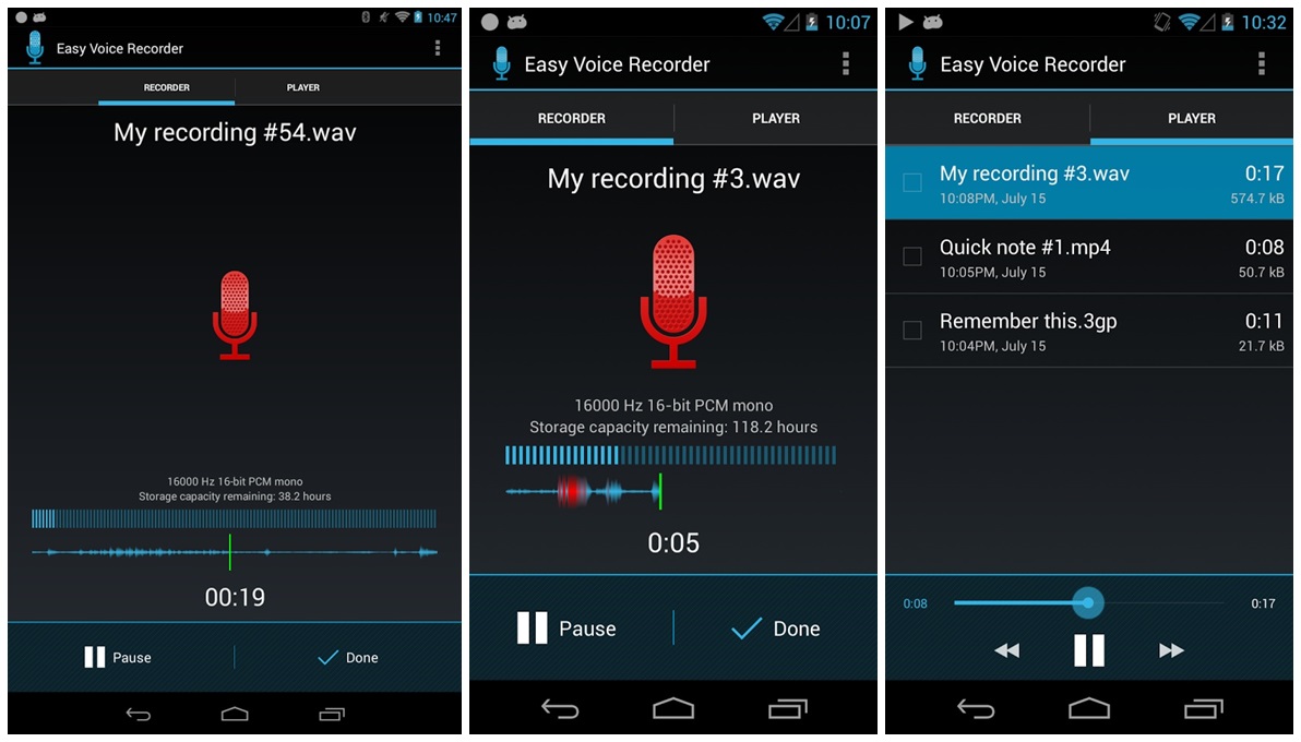 Easy Voice Recorder là một phần mềm đơn giản, dễ sử dụng với khả năng ghi âm theo các định dạng PCM và AAC chất lượng cao. Quá trình ghi âm có thể diễn ra dưới nền, và người dùng có thể điều khiển qua một widget trên màn hình chủ. Easy Voice Recorder hỗ trợ ghi âm bằng micro Bluetooth, tăng âm lượng đầu vào nhờ phần mềm tăng tiếng micro. Phần mềm sẽ tự động bỏ qua và không ghi âm những đoạn im lặng.