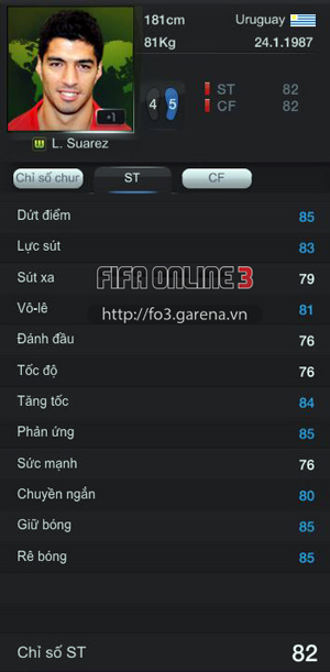 Sau một mùa giải cực kỳ thành công trên phương diện cá nhân, tiền đạo Uruguay đã được nhà phát triển cập nhật chỉ số rất mạnh tay. Điều này khiến anh trở thành một trong những tiền đạo hot nhất trên thị trường chuyển nhượng. Thẻ World Cup của Suarez sau khi xuất hiện đã được rất nhiều HLV mua về. Mặc dù cơ hội vô địch cho Uruguay là không cao, nhưng trong game, Suarez rất có thể sẽ tỏa sáng dưới bàn tay các HLV FIFA Online 3.