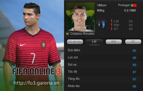 Thẻ World Cup của CR7 trong game mang chỉ số rất cao (LW 84), với các chỉ số tiền đạo quan trọng đều ở mức trên 80, hứa hẹn sẽ đem đến sức mạnh tuyệt vời trên hàng công của những ai sở hữu. Đặc biệt khi được cho đá cắm, sự nguy hiểm của cầu thủ này được tăng lên bội phần.