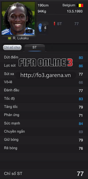 Trong số những cầu thủ trẻ xuất hiện tại Brazil mùa hè này, Lukaku là một trong những cái tên được mong đợi bậc nhất. Anh được hy vọng sẽ là chìa khóa để giúp tuyển Bỉ tiến sâu, và có thể sẽ gây bất ngờ. Trong FIFA Online 3, với tốc độ cùng sức mạnh trời phú, Lukaku được dự đoán sẽ khiến mọi hàng thủ chắc chắn nhất phải e dè kiêng nể, và các siêu sao phòng ngự dày dặn nhất cũng sẽ phải hoạt động hết công suất khi đối mặt với tài năng 20 tuổi này.