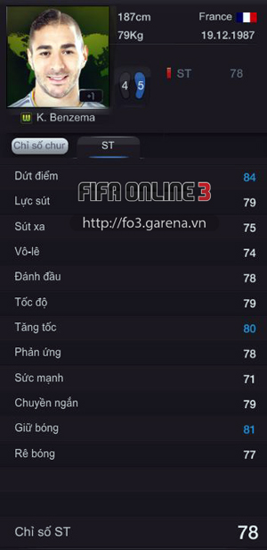 Trong FIFA Online 3 hiện tại, Benzema thẻ World Cup đang cực hot, với giá bán ngất ngưởng (dao động từ 6,5-8 triệu EP) chỉ thua mỗi Ronaldo, đó là một mức giá hơi cao. Với chỉ số đồng đều, cũng như việc Benzema là chân sút đáng tin cậy duy nhất của tuyển Pháp, việc cân nhắc “tậu” anh này về sử dụng cũng là một ý kiến không tồi.