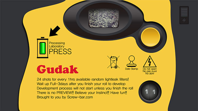 Gudak cho phép bạn chụp với một cuộn phim ảo, và bạn chỉ có thể chụp 24 tấm ảnh cho mỗi cuộn. Khi chụp xong một cuộn, bạn phải chờ 1 tiếng sau mới có thể "lắp" cuộn mới vào và chụp tiếp. Để xem ảnh, bạn sẽ phải nhấn nút "develop" (rửa ảnh) và chờ ba ngày sau mới xem được.