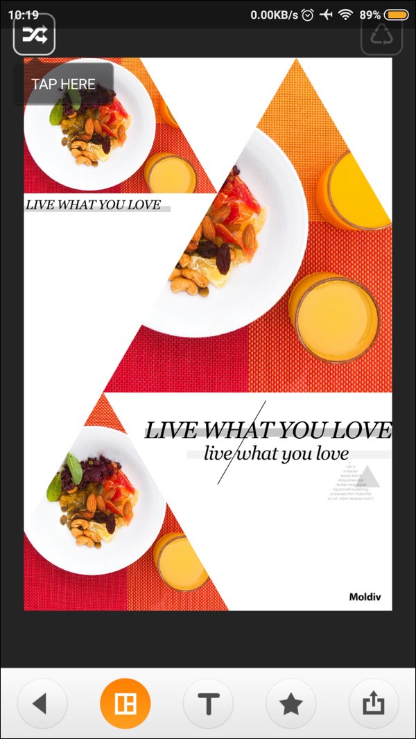 Không phải ứng dụng chuyên về chụp ảnh ẩm thực nhưng Moldiv sở hữu tính năng độc đáo riêng cho phép người dùng biên tập ảnh món ăn theo phong cách tạp chí, ghép ảnh một cách đơn giản chỉ bằng vài cú chạm vào màn hình smartphone.