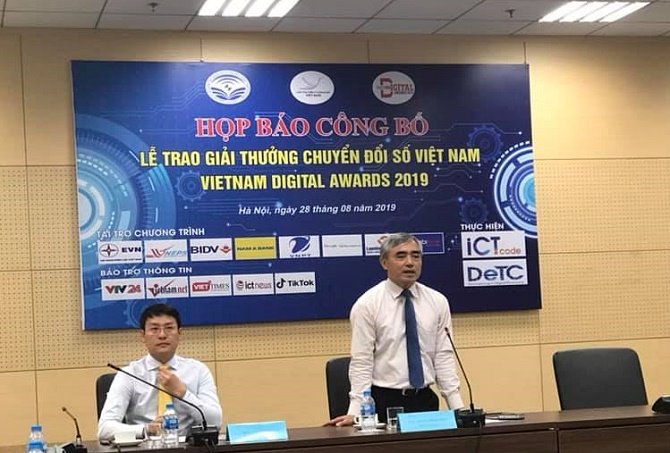 Chủ tịch Hội Truyền thông số Việt Nam Nguyễn Minh Hồng (bên phải) chủ trì buổi họp báo công bố giải thưởng Chuyển đổi số Việt Nam năm 2019. |