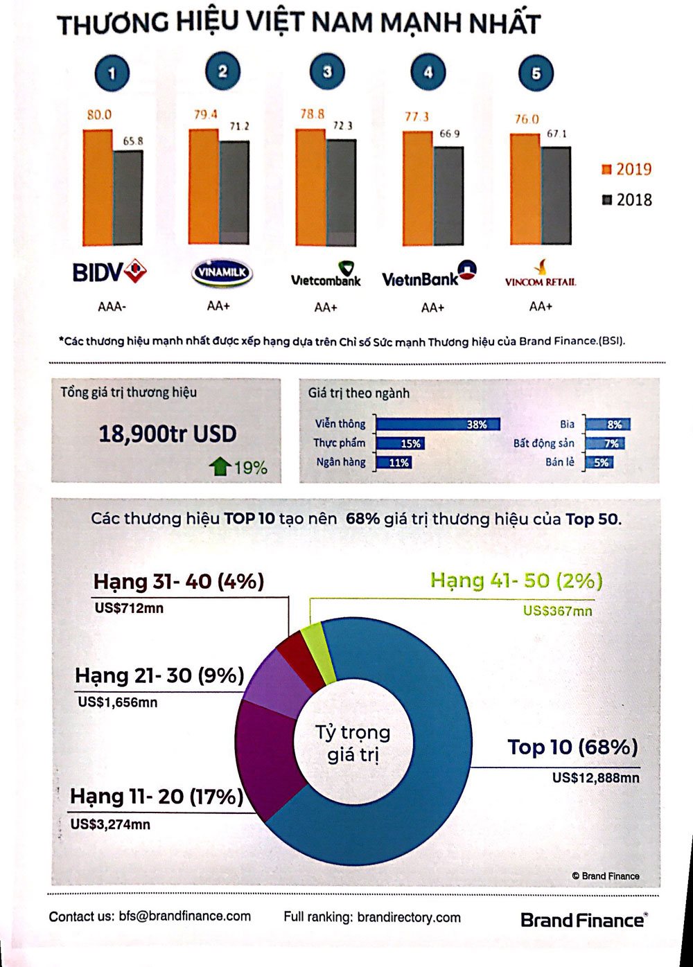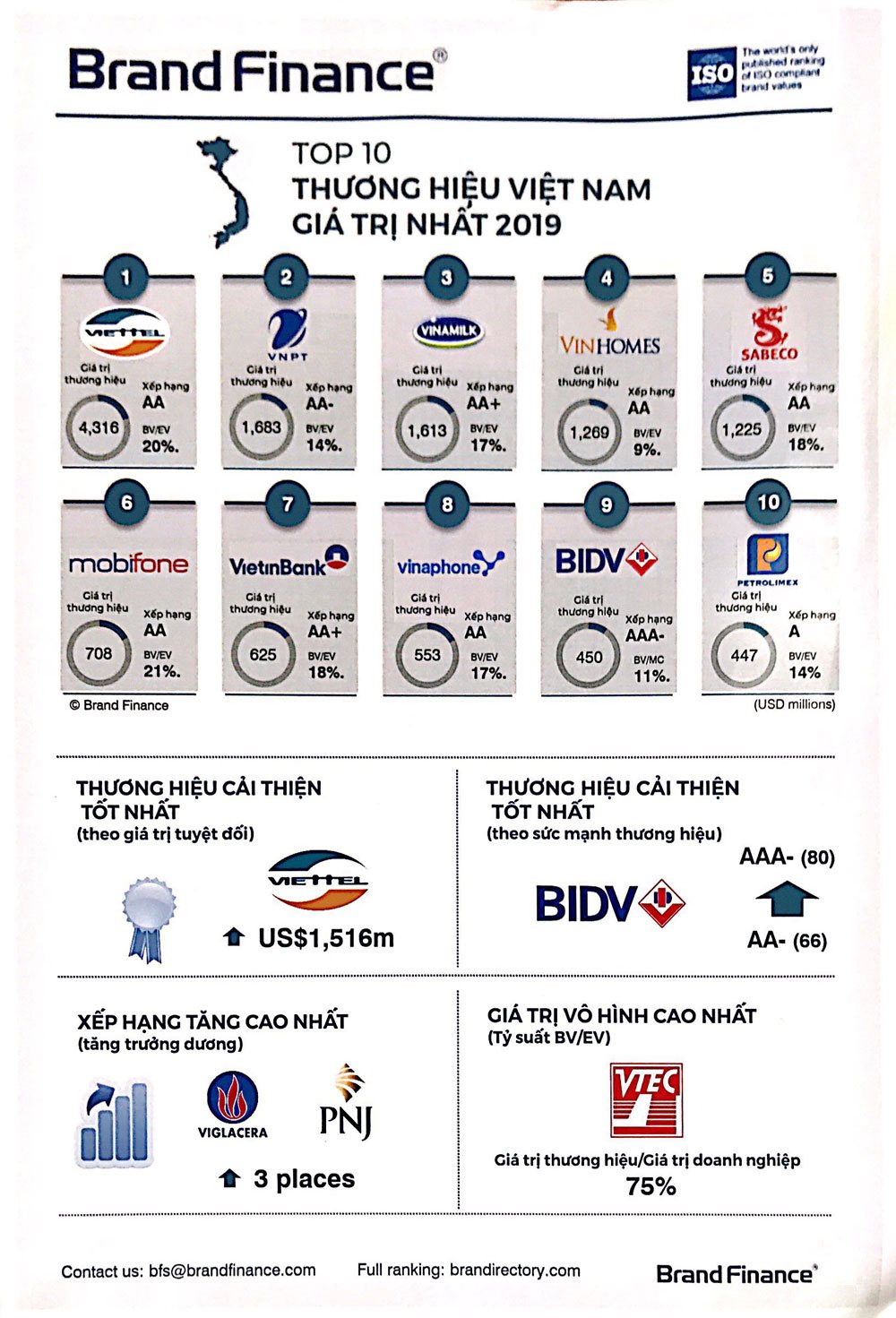 Top 10 thương hiệu Việt Nam giá trị nhất 2019 được trao cho Viettel, VNPT, Vinamilk, Vinhomes, Sabeco, MobiFone, VietinBank, VinaPhone, BIDV, Petrolimex. Trong đó Viettel đứng đầu danh sách với giá trị thương hiệu được định giá 4,316 tỷ USD.