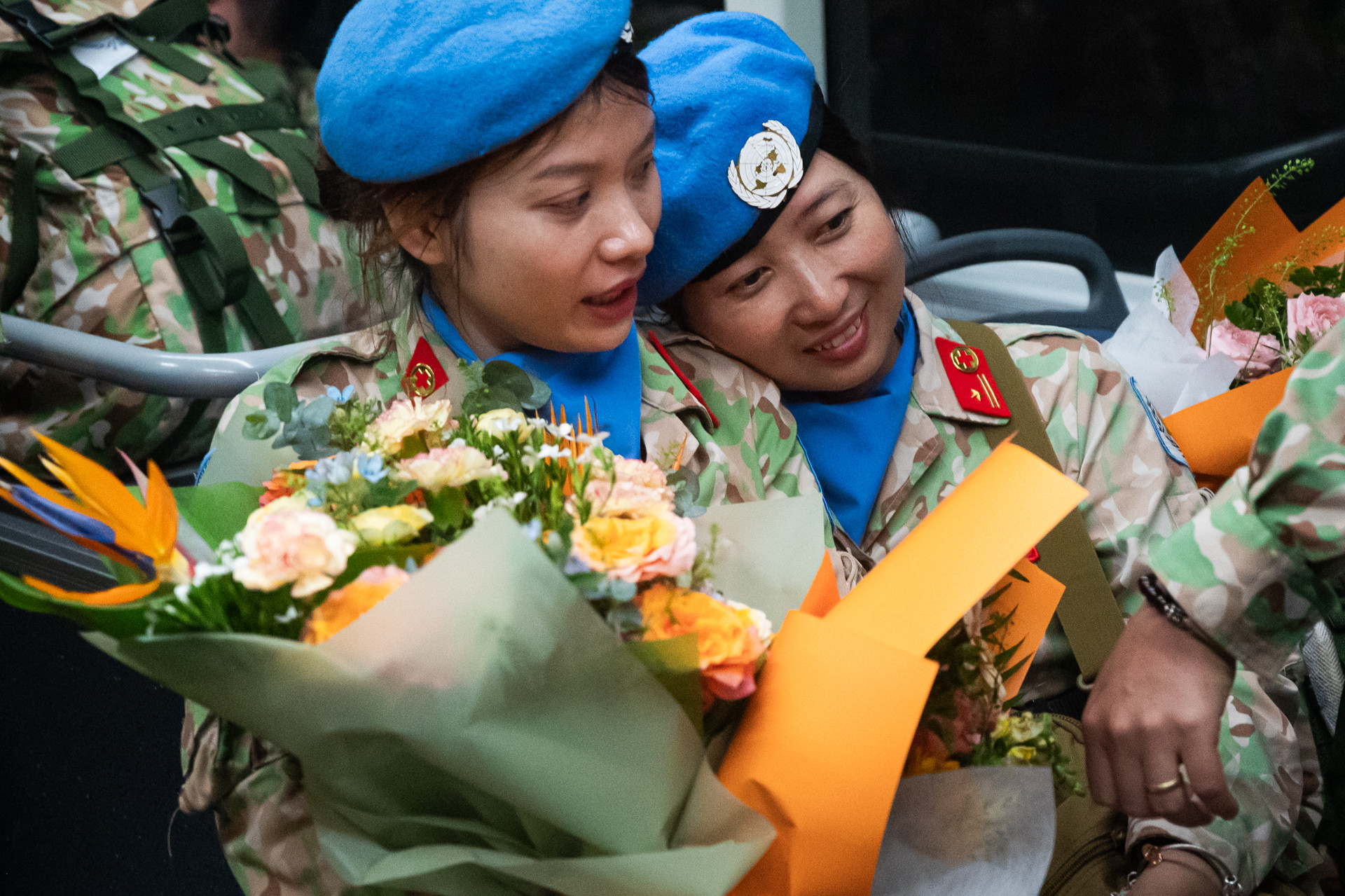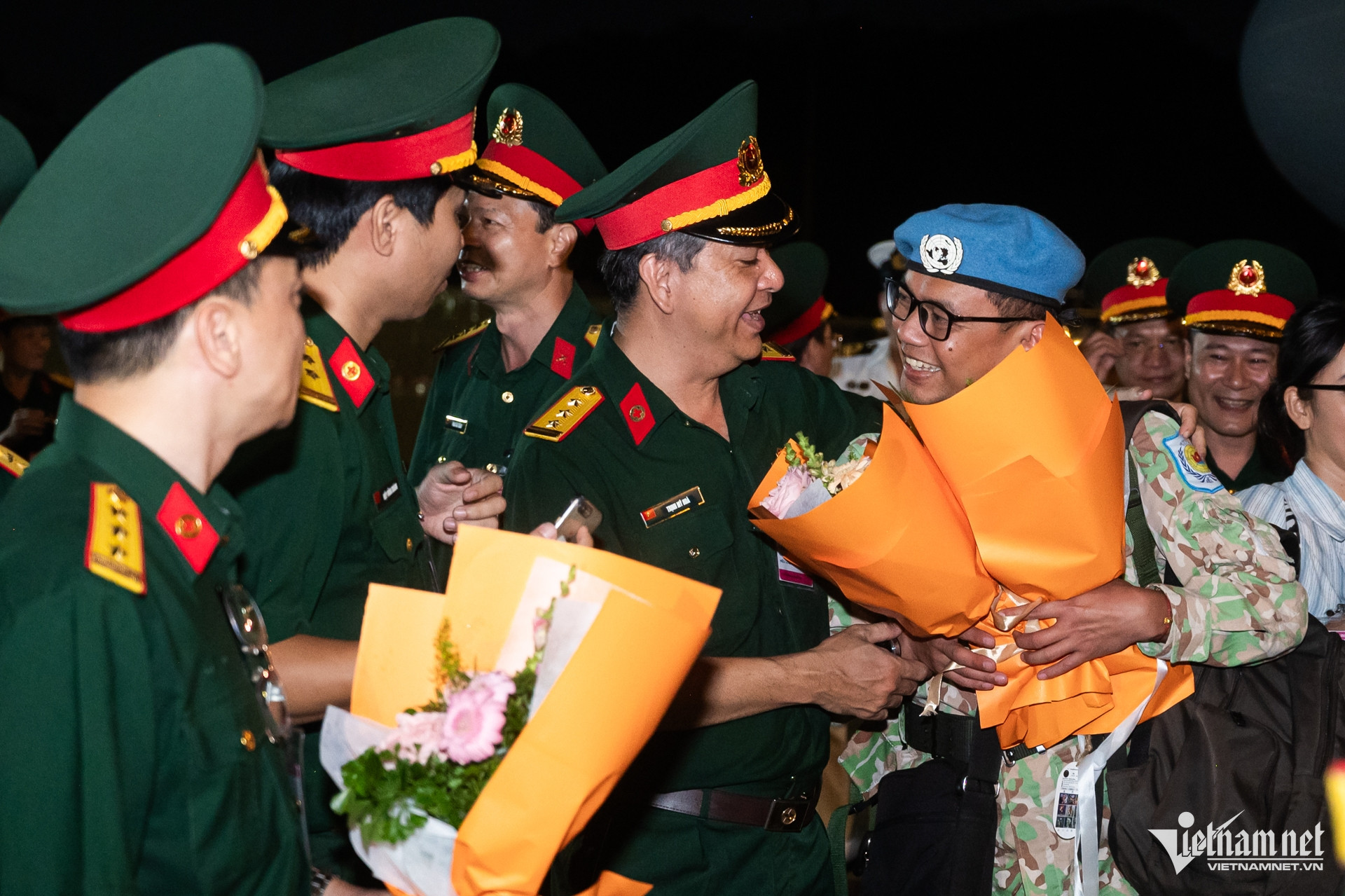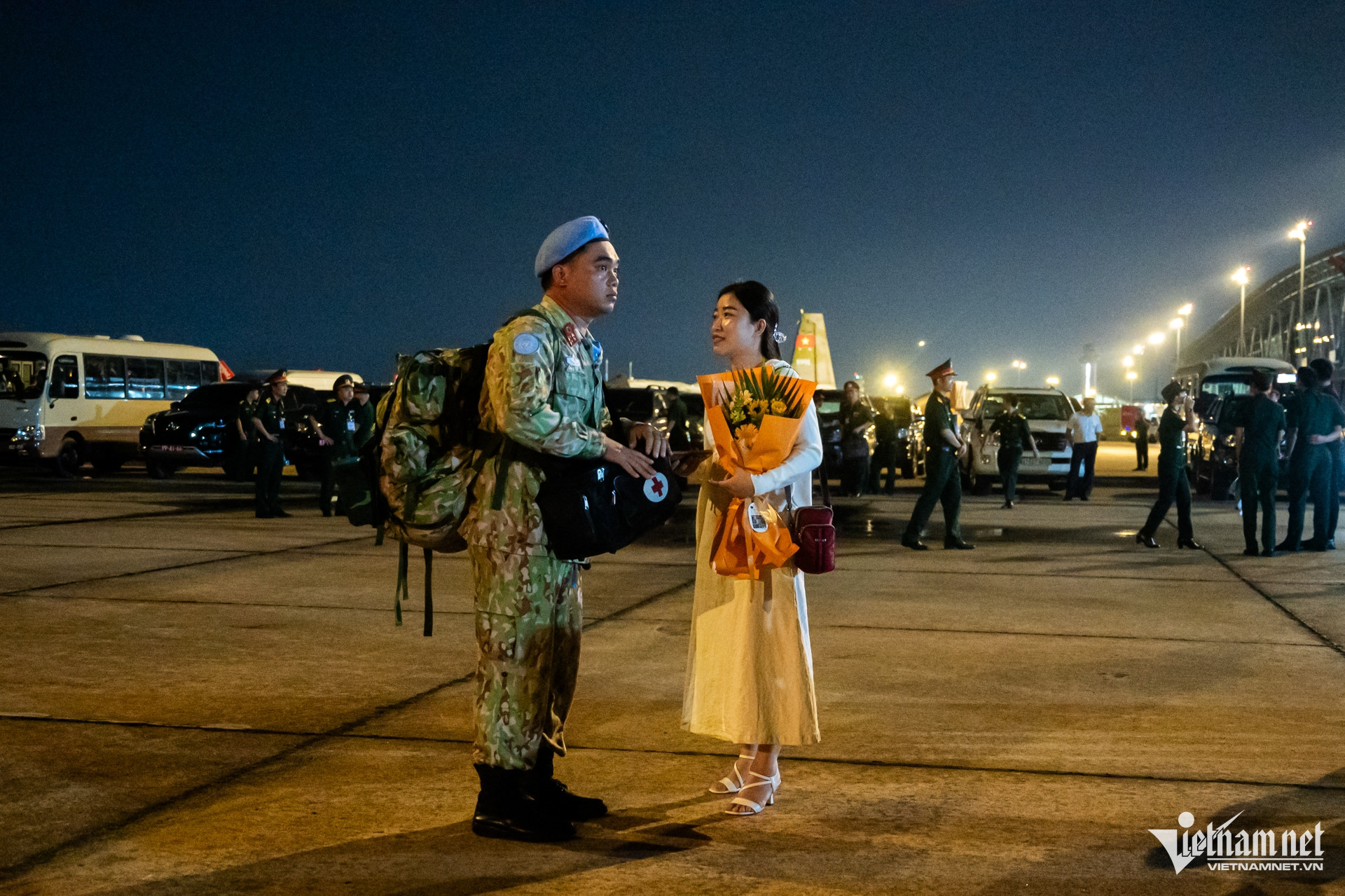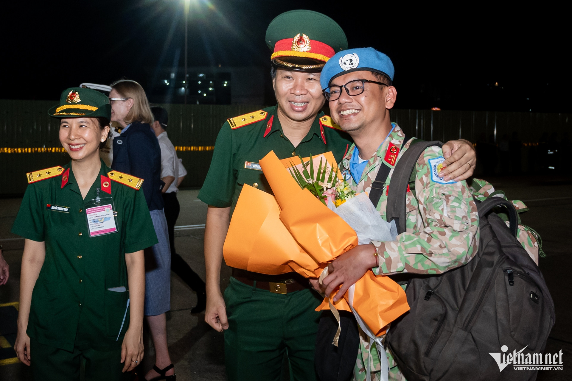 Thiếu tá Trần Thuận Trang hạnh phúc khi gặp lại chồng. Đây là lần thứ 2 đón vợ trở về từ Nam Sudan, anh Trịnh Ngọc Thao vẫn hồi hộp, mong chờ như lần đầu. "Nhiệm vụ của đất nước là quan trọng nhất, tôi cảm thấy tự hào vì vợ và các đồng nghiệp đã hoàn thành xuất sắc", anh Thao nói.