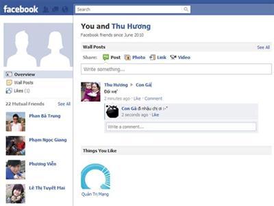 Đây là nơi bạn có thể xem được “chỉ số tình bạn” với 1 người trong nhóm, tính năng này hiển thị cụ thể thời gian khi 2 người bắt đầu kết bạn và những hoạt động khác như Wall post, comment, những bức ảnh, sự kiện hoặc thay đổi trạng thái được tag cùng nhau. Để hiển thị, các bạn hãy gõ địa chỉ theo cú pháp sau vào trình duyệt: