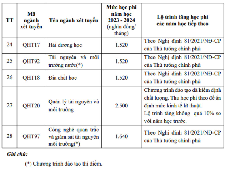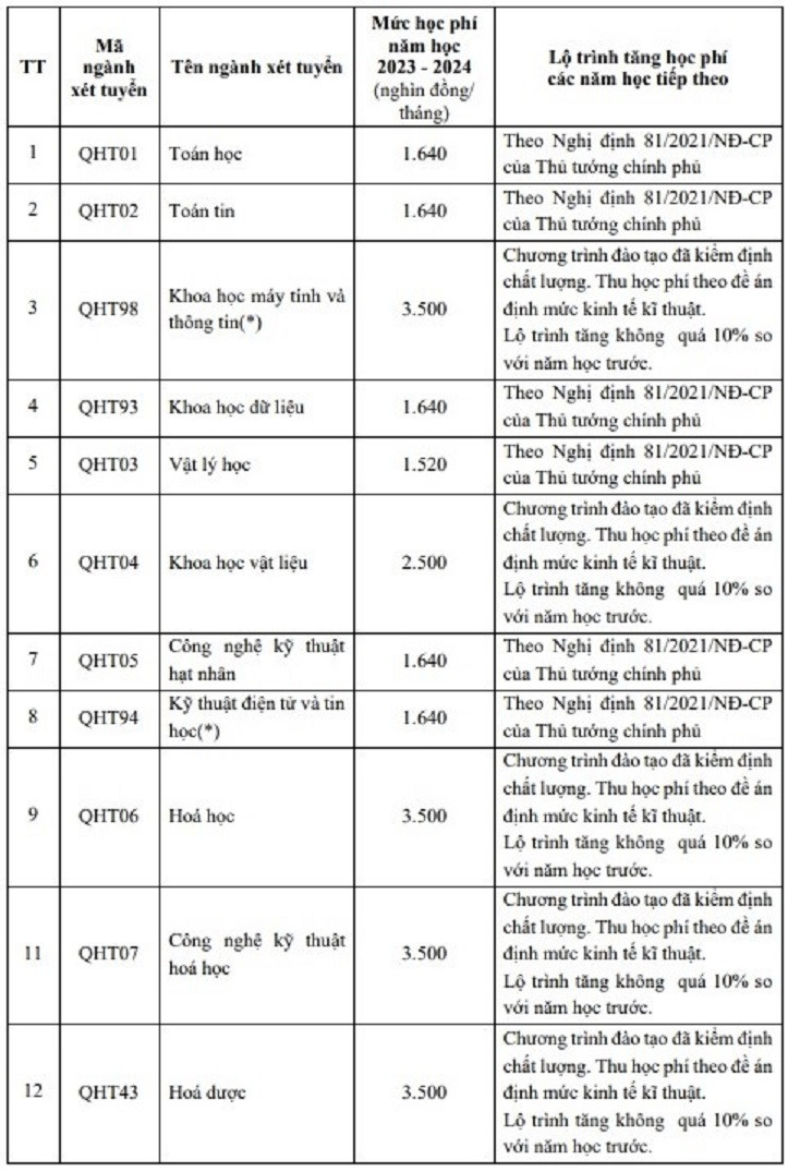 Dự kiến mức học phí năm học 2023-2024 của Trường ĐH Khoa học Tự nhiên và lộ trình tăng học phí các năm học tiếp theo như sau: