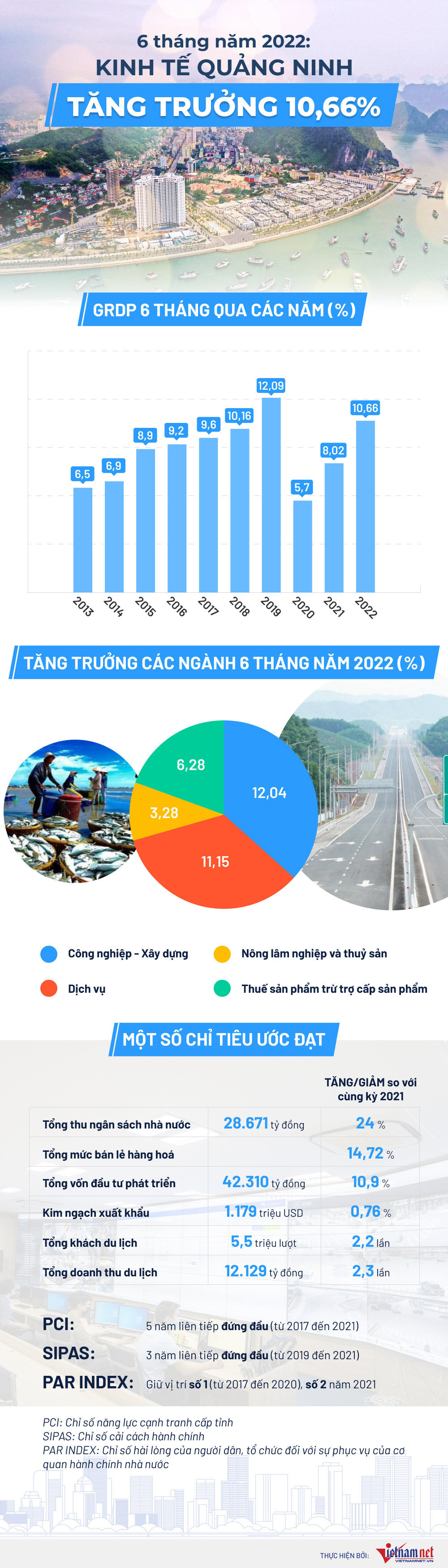 6 tháng năm 2022, tốc độ tăng trưởng kinh tế (GRDP) của tỉnh Quảng Ninh ước tăng 10,66% - cao hơn 2,91 điểm % so với cùng kỳ năm 2021, đứng thứ 4 trong vùng Đồng bằng sông Hồng.