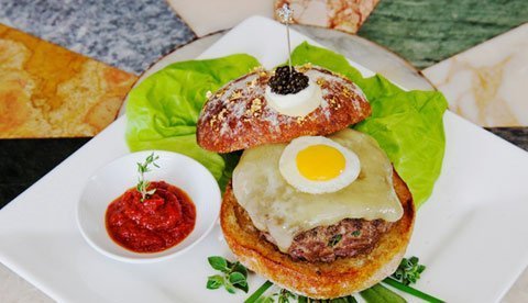Thành phần của chiếc hamburger đắt nhất thế giới gồm có bò Wagyu, trứng cá muối Kaluga, kem chua Pháp, bánh blini nổi tiếng của Nga, muối biển Thái Bình Dương hun khói gỗ Salish Alderwood, bơ đặc biệt, nấm cục đen, trứng chim cút chiên. Đặc biệt, sau khi ăn khách hàng sẽ được dùng tăm bằng vàng ròng nạm kim cương.
