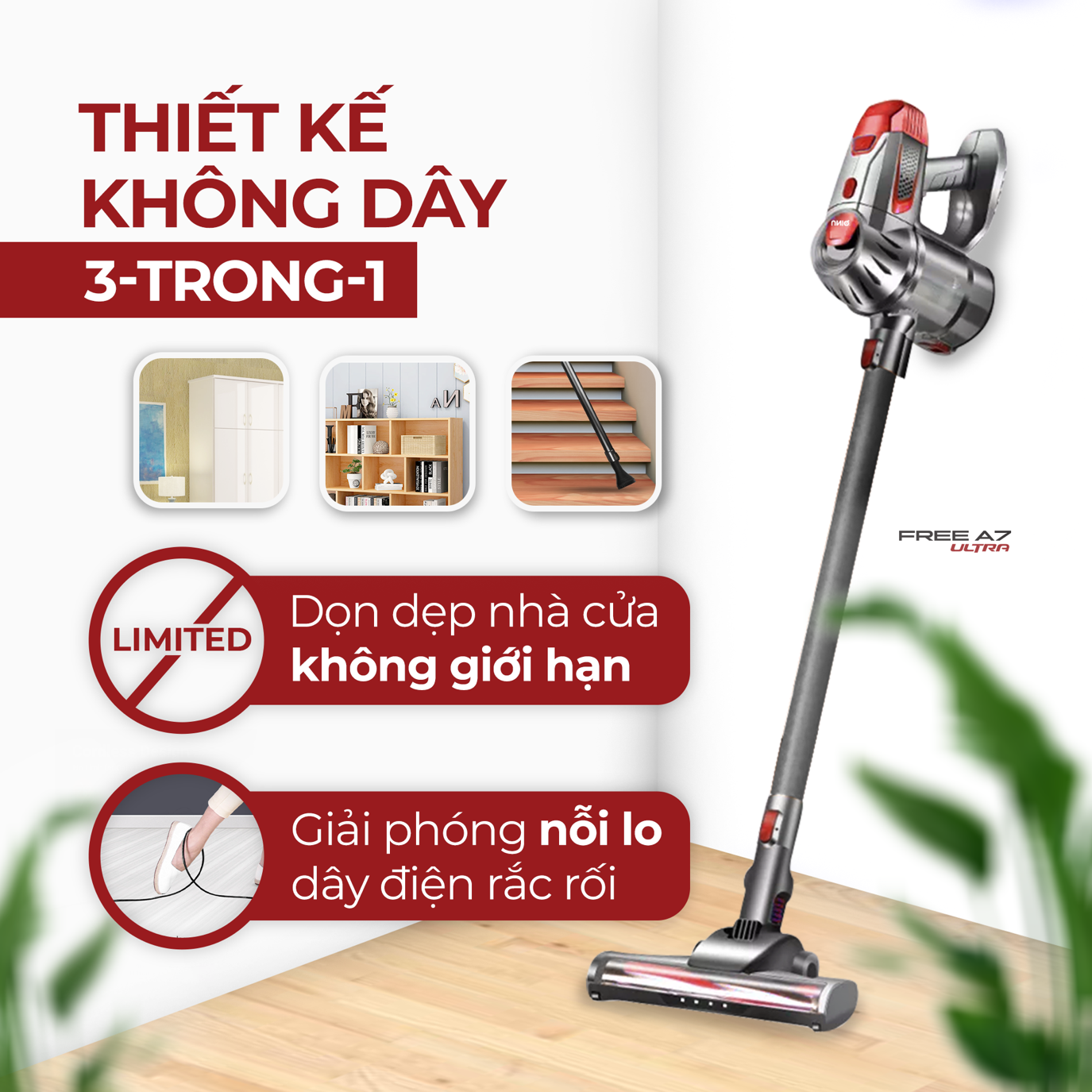 Máy hút bụi không dây cầm tay UNIQ Free A7 Ultra được thiết kế với tông màu xám - đỏ chủ đạo khiến tổng thể máy sang trọng, hiện đại. Động cơ, hộp chứa bụi và pin đều được tích hợp với tay cầm, giúp máy gọn nhẹ đáng kể. Toàn bộ máy chỉ nặng hơn 1,7 kg, giúp khách hàng dễ dàng sử dụng mà không lo mỏi tay.