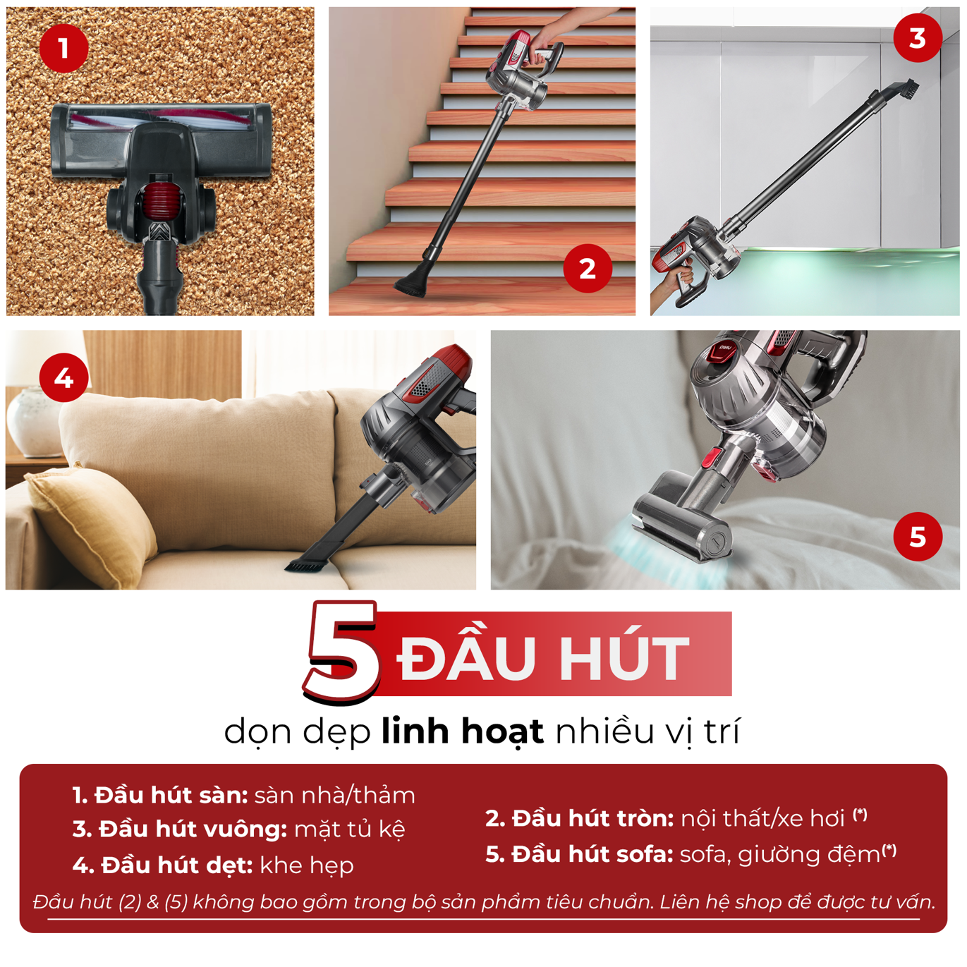 Tuy giá bán chưa đến 3 triệu nhưng UNIQ Free A7 Ultra có đa dạng phụ kiện đi kèm. Bộ phụ kiện đầy đủ của máy gồm 5 loại đầu hút với hình dạng và tiết diện khác nhau phục vụ cho từng vị trí khác nhau như sàn nhà, giường đệm, sofa, rèm cửa, khe hẹp… Đặc biệt, đầu hút sàn của máy còn được thiết kế đèn LED định vị bụi bẩn do đó mọi ngóc ngách trong nhà của bạn đều được làm sạch.