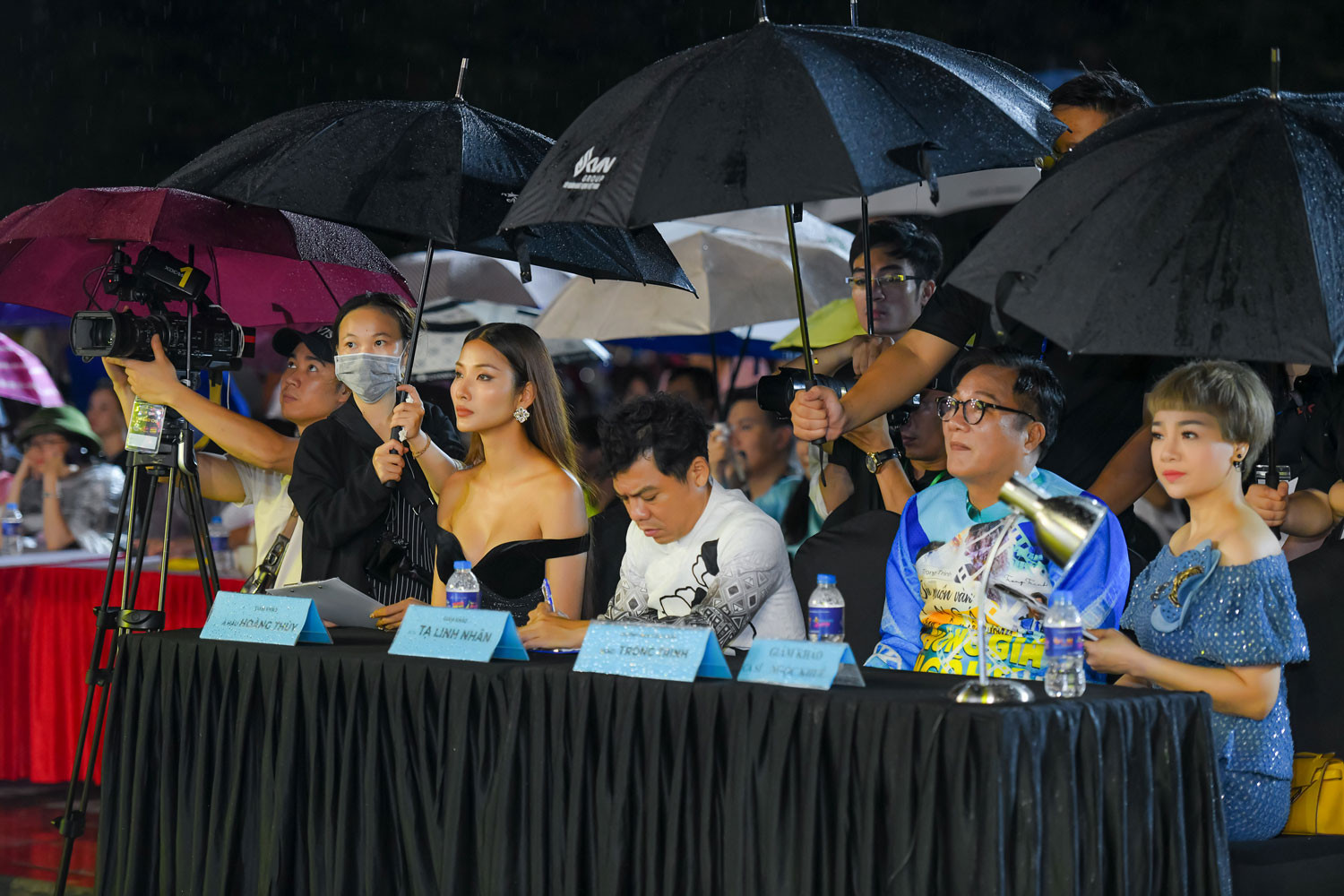 NSND Trọng Trinh "cảm động khi đến giờ phút này, giữa trời mưa, mọi người vẫn ngồi lại”. Nam diễn viên bày tỏ sự cảm phục đối với tình yêu nghệ thuật của các thí sinh nhí.