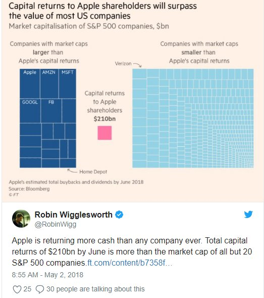 Tờ Financial Times đã tung ra một biểu đồ được thiết kế rất đáng yêu, nói về số tiền đáng kinh ngạc mà Apple đang trả lại cho các cổ đông của 20 công ty khác nhau dựa trên chỉ số cổ phiếu S&P 500 là 210 tỷ USD: