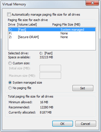 Windows sử dụng một loại file có tên Page File để làm bộ nhớ ảo, san sẻ gánh nặng với RAM khi nó đầy. Kích thước Page File tùy thuộc vào từng phiên bản Windows, chẳng hạn ở Windows 7 file này có cùng kích thước với RAM: chẳng hạn máy bạn có 8GB RAM thì Page File sẽ có dung lượng 8GB. Tuy nhiên, với một máy tính có RAM 8GB, Page File có dung lượng lớn như vậy là việc lãng phí, do vậy bạn có thể thực hiện các bước sau để điều chỉnh lại kích thước của nó: