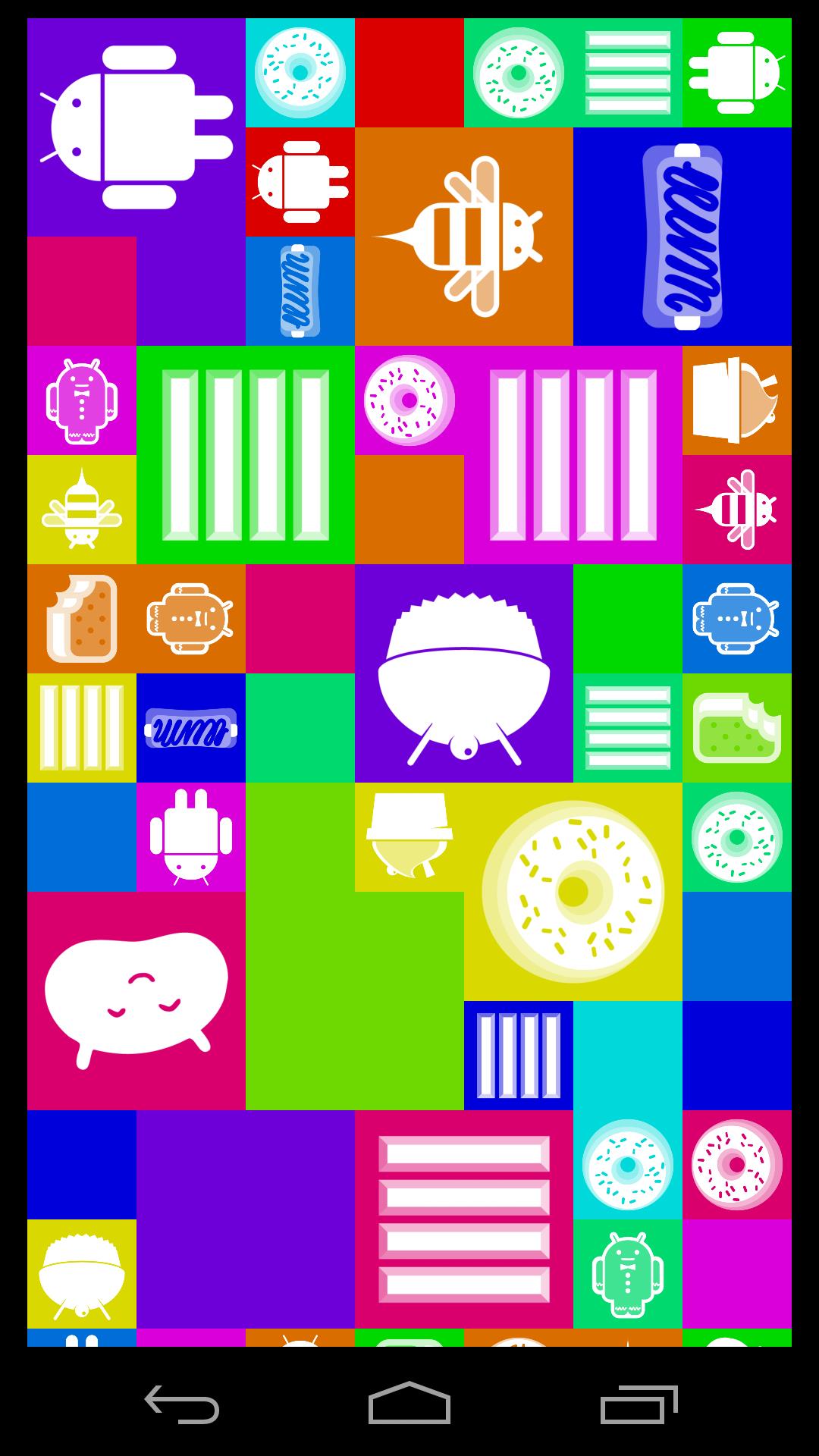 Trong bản xem trước của Android L, vào Settings > About phone rồi nhấn Android Version vài lần, bạn sẽ thấy một màn hình với nhiều ô vuông, hình chữ nhật xanh, đỏ, chuyển động không theo quy tắc nào cả.