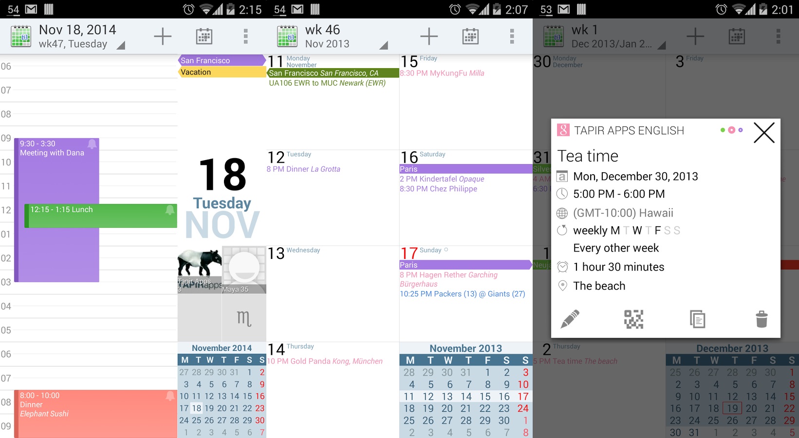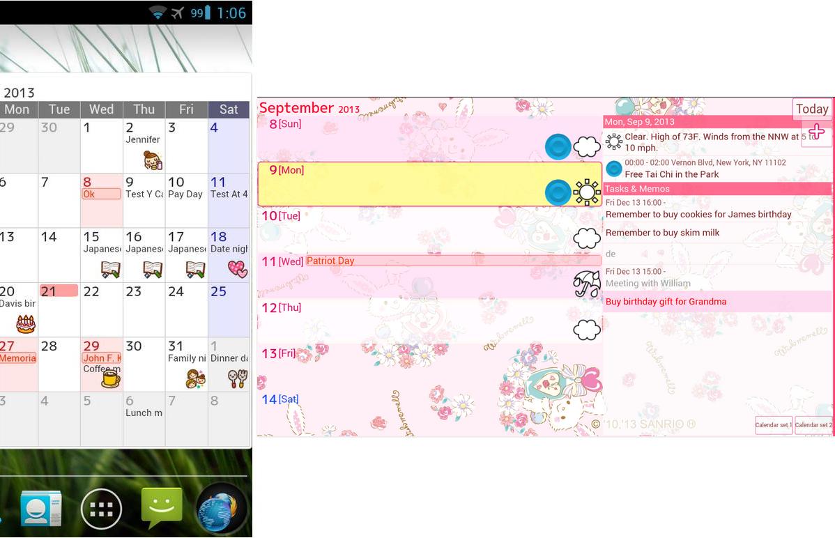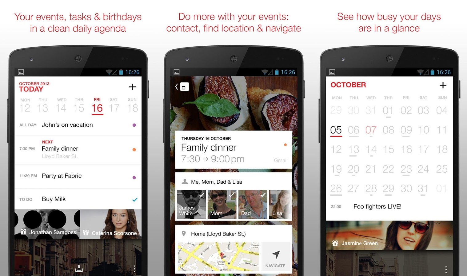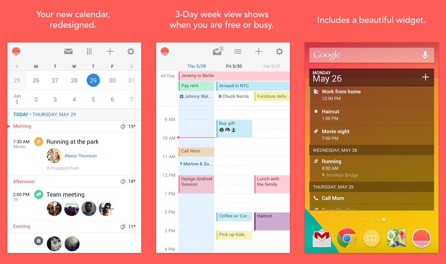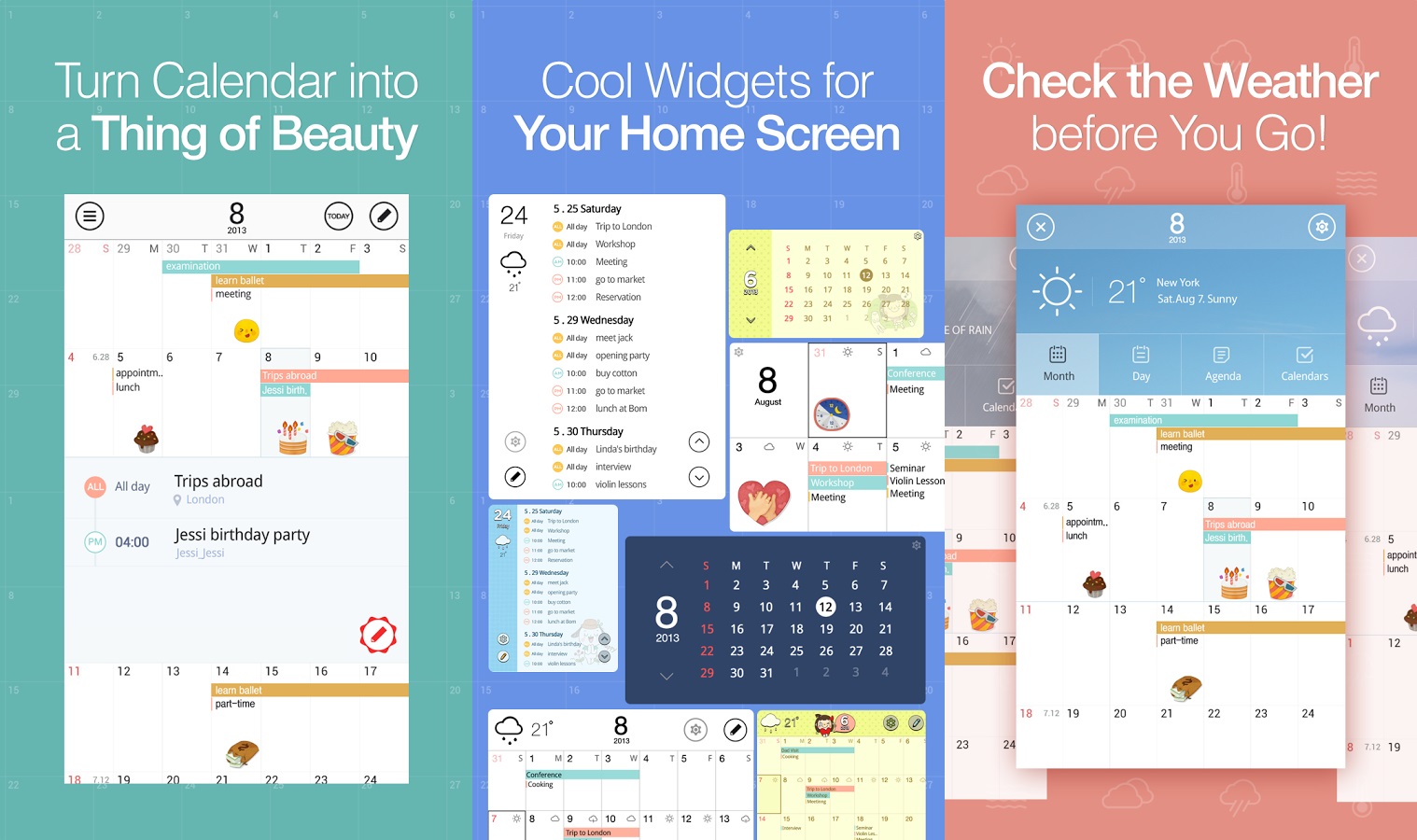 Cal: Android Calendar của nhà phát triển Any.Do, hay gọi đơn giản Any.do Cal, là ứng dụng lịch có giao diện cực kỳ đẹp mắt. Any.do Cal cung cấp nhiều hình nền khác nhau sẽ thay đổi theo ngày. Với Any.do Cal, bạn có thể dễ dàng lưu lại một sự kiện mà không phải thực hiện quá nhiều bước.