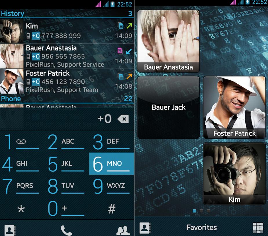 PixelPhone PRO có thiết kế rất bắt mắt. Ứng dụng hỗ trợ cả các thiết bị hai SIM và cho phép gán những thao tác khác nhau cho từng nhóm trong danh bạ.