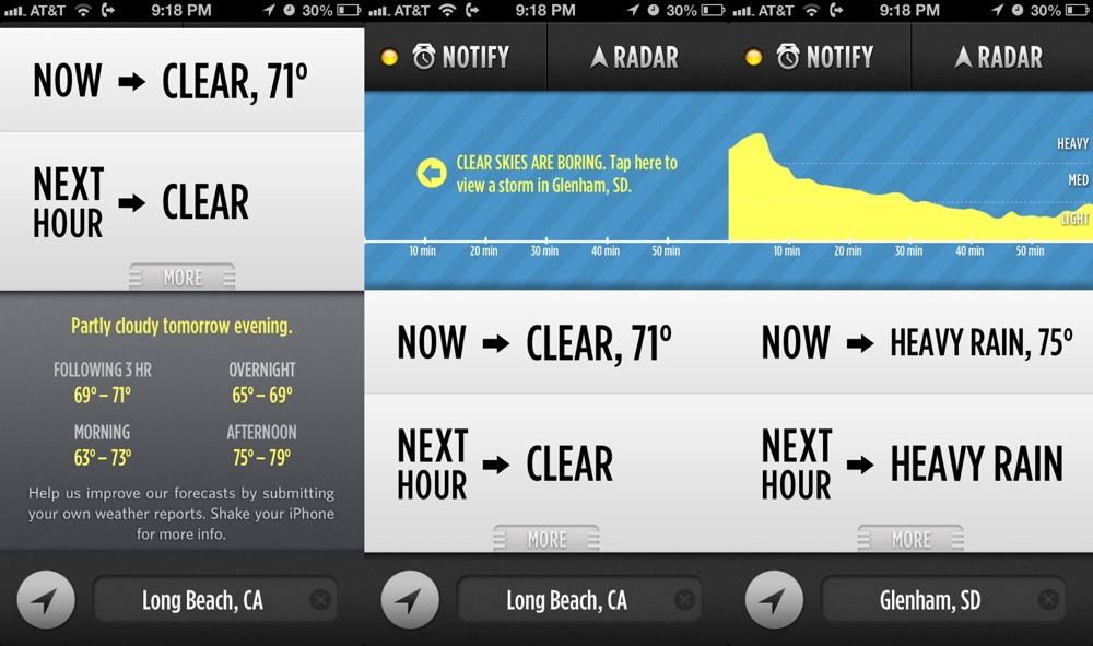 Today Weather giúp bạn xem được thời tiết hiện tại và dự báo ngay khi mở ứng dụng. Vuốt sang phải để xem thông tin theo giờ, trong khi vuốt sang trái để hiển thị dự báo tuần tới. Ứng dụng sử dụng cơ sở dữ liệu của Dark Sky để có dự báo chính xác hơn nhưng không có thông báo tự động tương tự. Nói cách khác, nó giống như phiên bản “nhẹ đô” hơn của Dark Sky.