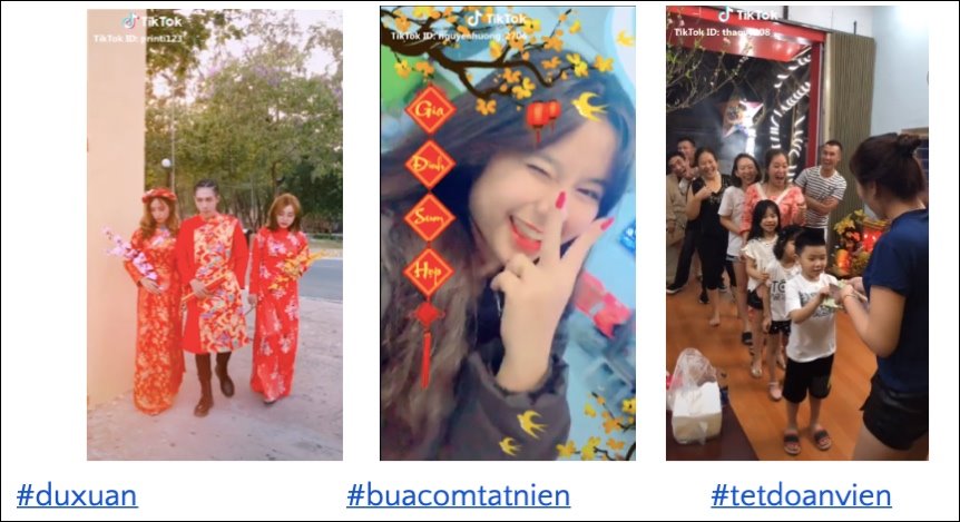 Các video thể hiện hình thức đa dạng và trẻ trung, thông qua các hashtag gồm: #hoinhanhdapgon (hỏi nhanh đáp gọn), #buacomtatnien (bữa cơm tất niên), #tetdoanvien (tết đoàn viên), #duxuan (du xuân), #donnghiepthoate (dọn nghiệp thoát ế) và #heovangmayman (heo vàng may mắn).