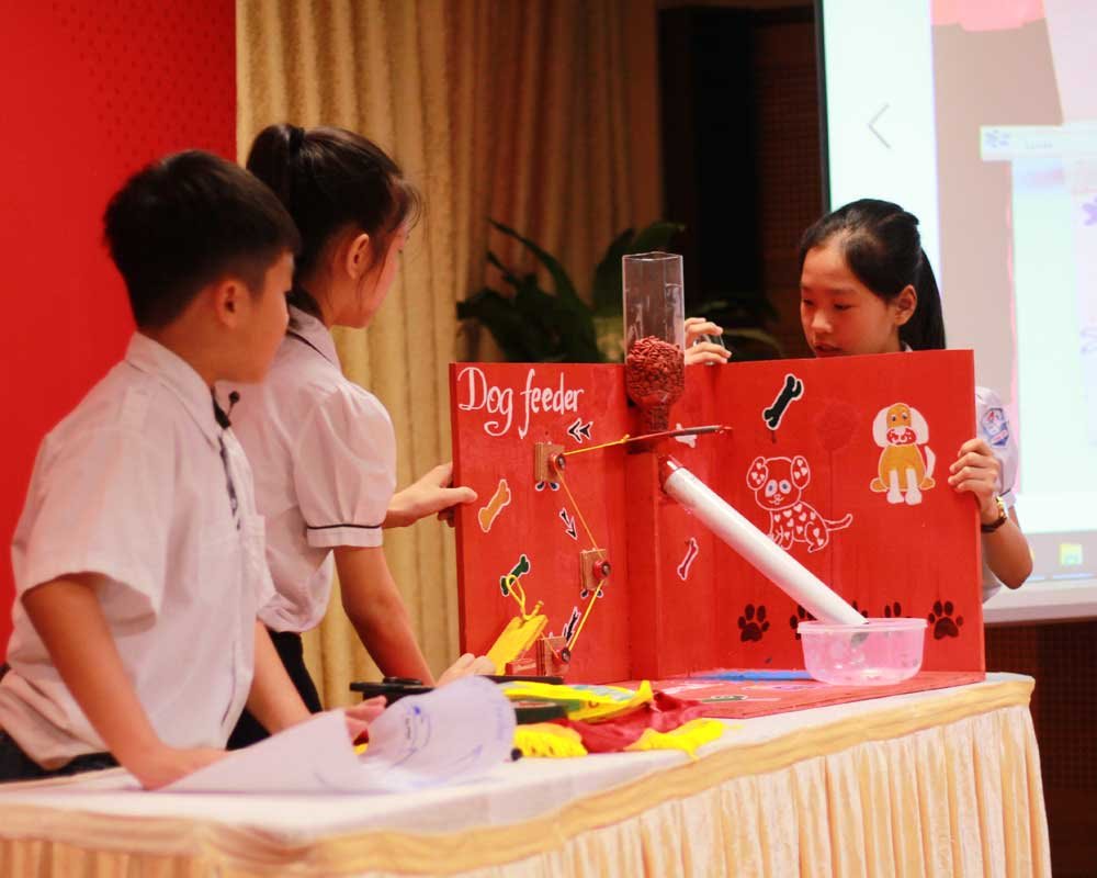 Học sinh trường Tiểu học Tân Triều đã thuyết trình sản phẩm sáng tạo STEM Dog Feeder (Máy đút thức ăn cho cún yêu) bằng tiếng Anh. |