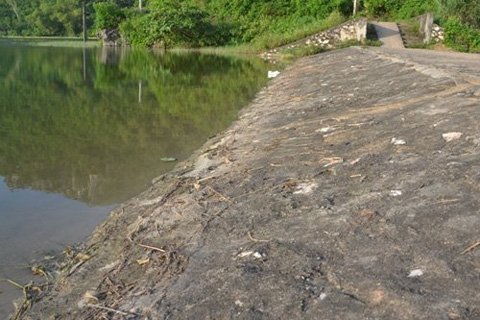 | Xung quanh khu vực mép hồ được xây đá kè thoai thoải với chiều dài khoảng 4m. Bề mặt kè này có nhiều rêu và dễ trơn trượt khi tắm - (Ảnh: VietNamNet) |