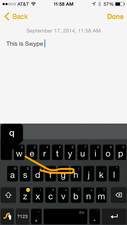 Swype (0,99 USD) cho phép bạn lướt ngón tay trên các ký tự để tạo thành từ hoàn chỉnh. Ứng dụng cũng có chức năng dự đoán từ, cụm từ như các phần mềm khác. Swype có 5 màu nền để lựa chọn, từ điển cá nhân và thao tác, biểu tượng tương tự phiên bản Android.