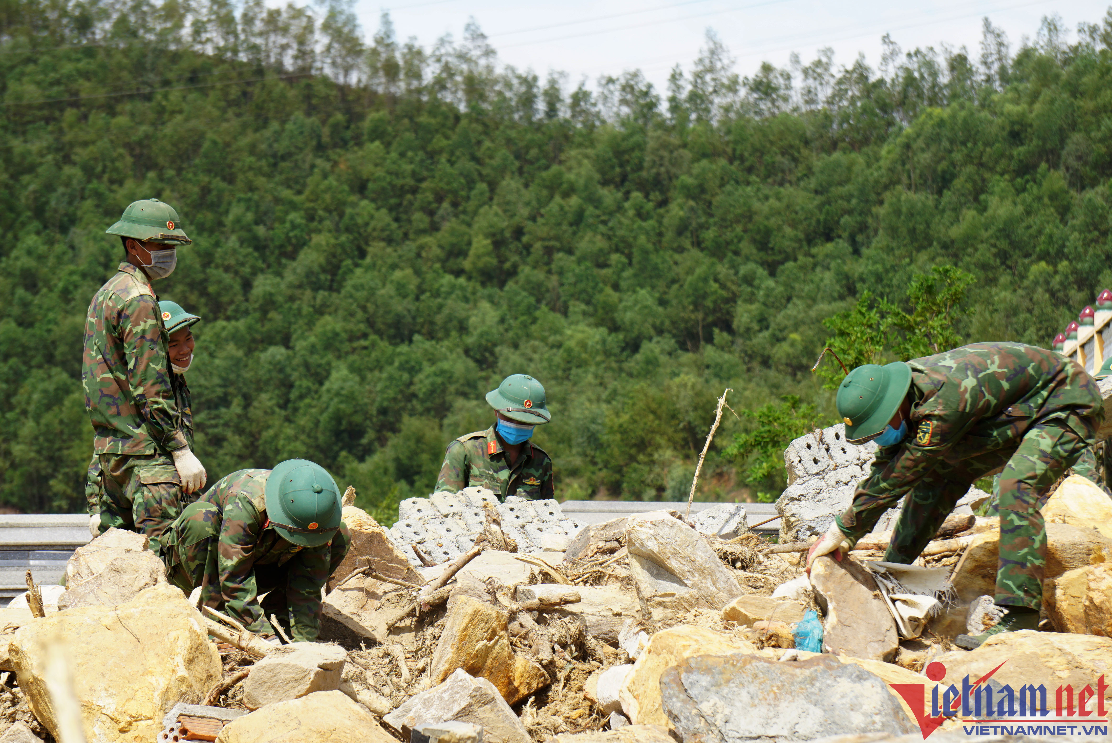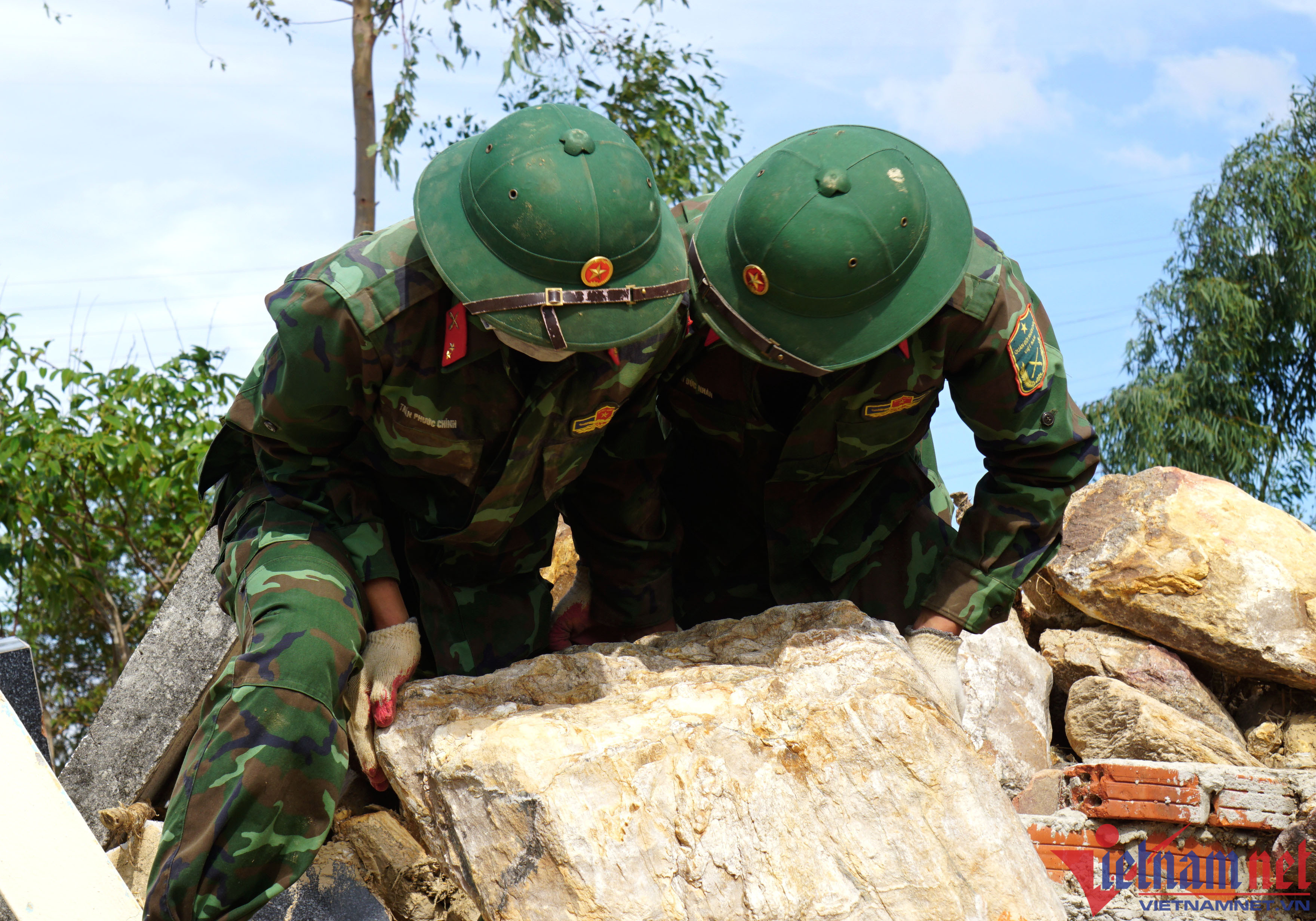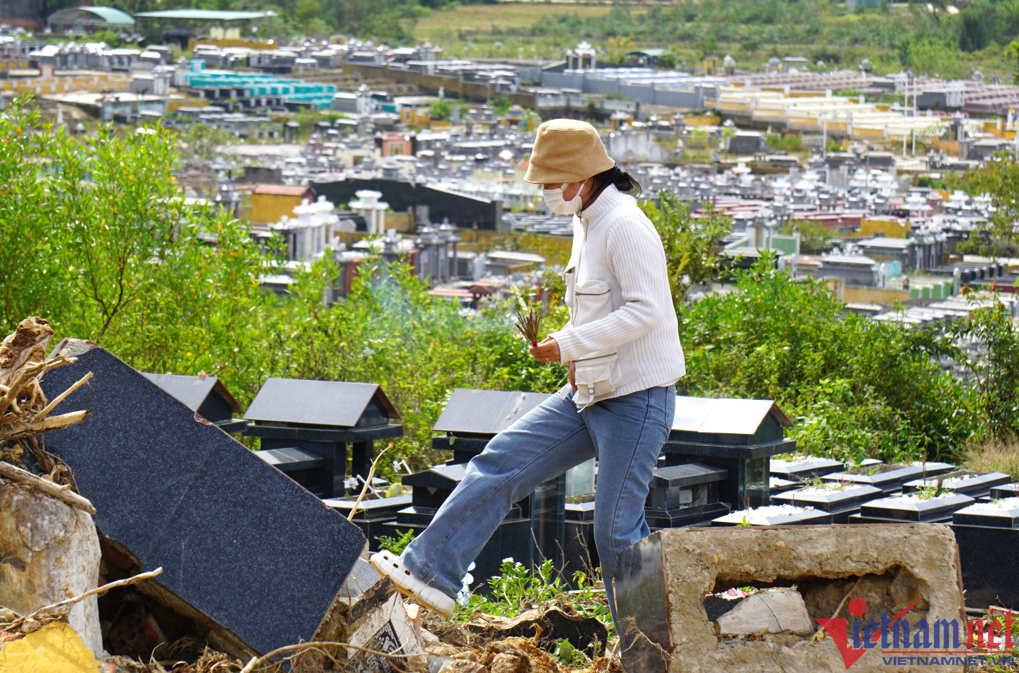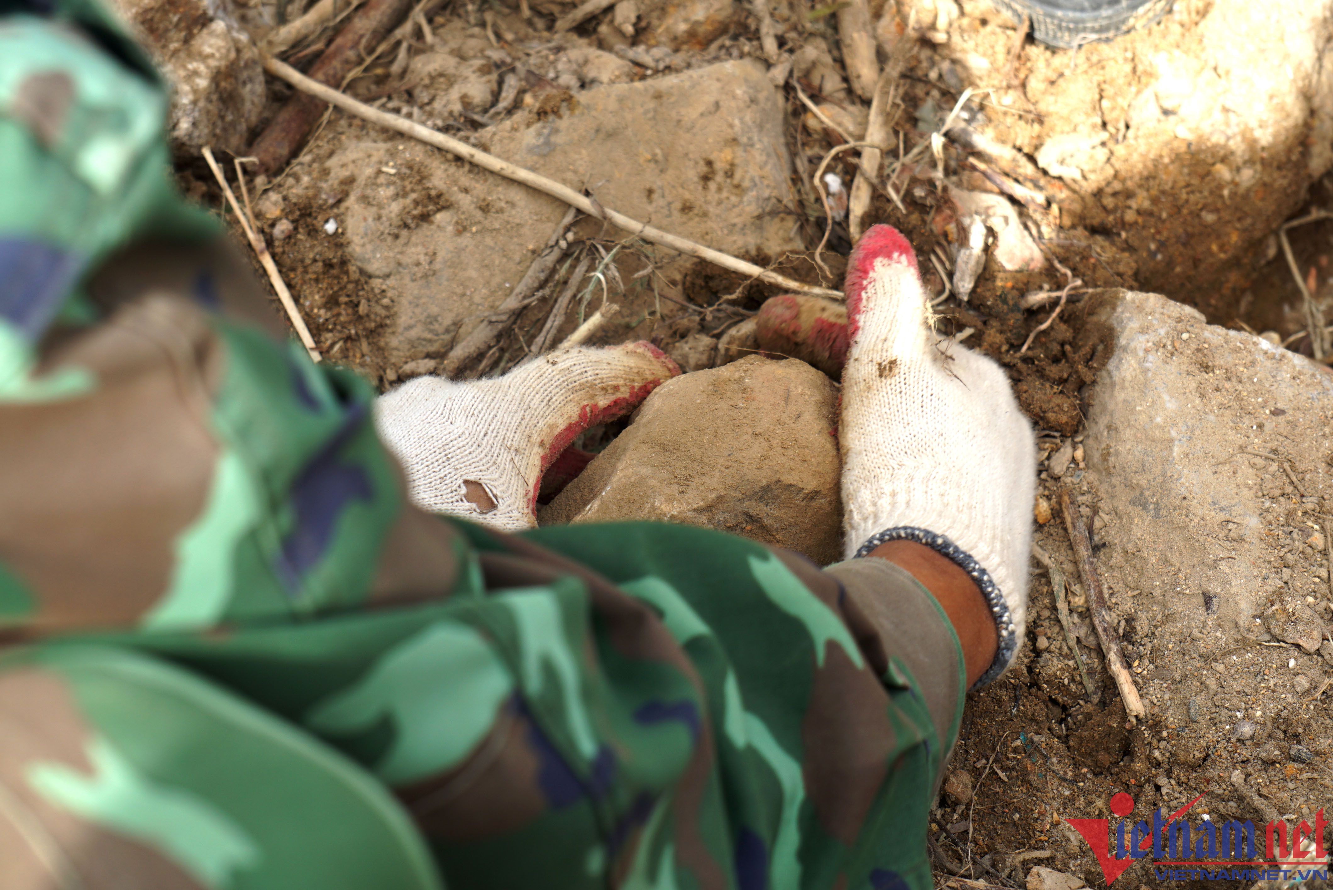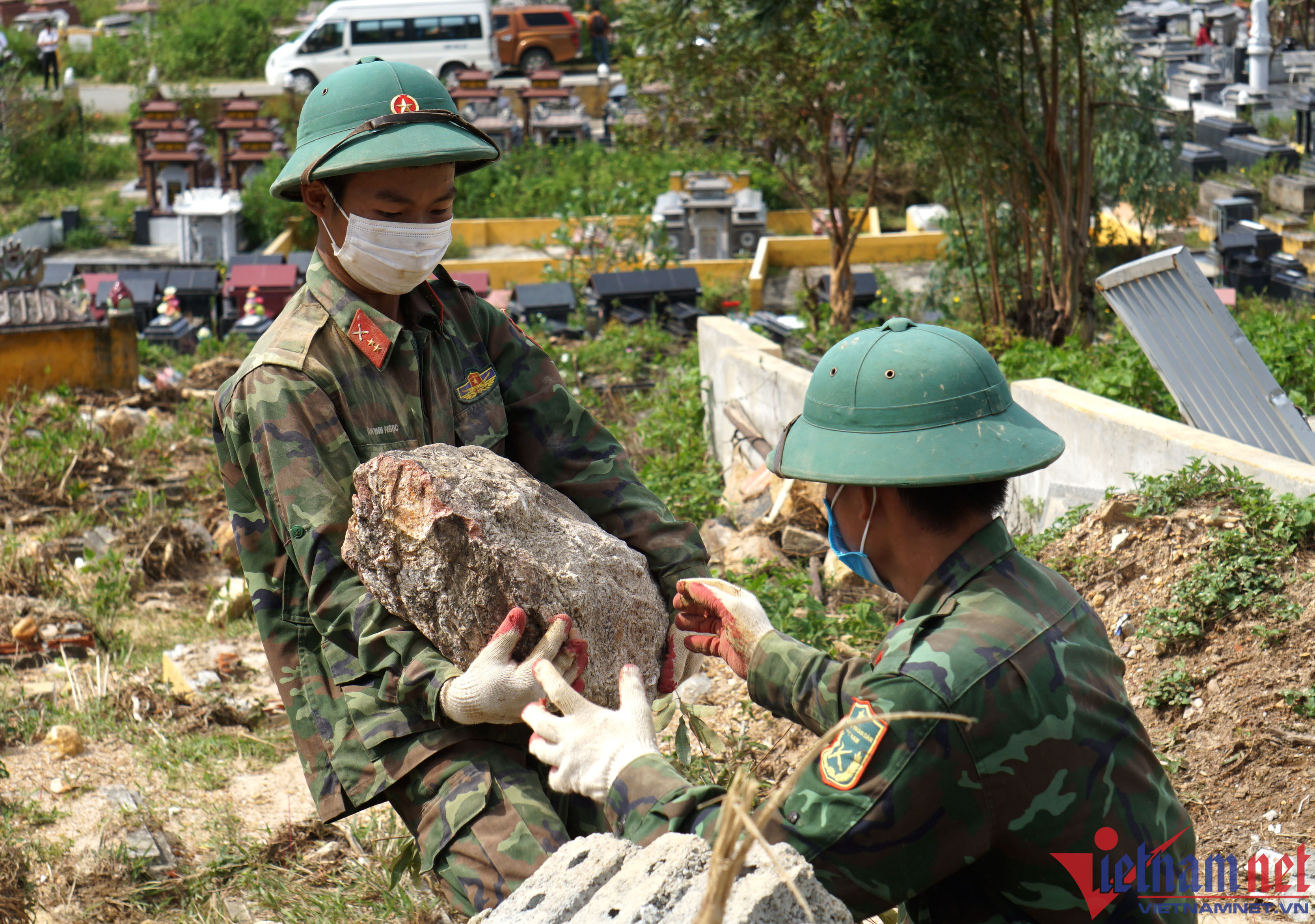 Các chiến sĩ lật từng tảng đá lớn, bới đất để tìm mộ bị vùi lấp. Tất cả được thực hiện cẩn trọng Một phần mộ được tìm thấy, các chiến sĩ hỗ trợ người dân di chuyển cát để đắp nềnSáng nay, nhiều người dân đến khu vực nghĩa trang để với hy vọng sớm tìm thấy mộ người thân. Không biết phần mộ bị cuốn đến đâu trong ngổn ngang đất đá, có người đành thắp hương vọng tại vị trí sạt lởThắp hương vọng vị trí mộ cháu bị cuốn trôi, ông Trần Quy (72 tuổi, ngụ phường Hòa Minh, quận Liên Chiểu) chia sẻ: "Thấy bộ đội tới giúp nhiều bà con rất mừng vì nhiều khu mộ của các gia đình gần như bị đổ úp hoàn toàn, sức dân không làm nổi. Mong sao lực lượng quân đội tìm thấy được nhiều mộ bị vùi lấp. Hiện nay nhiều phần mộ bị cuốn trôi không thể tìm thấy trong đó có cháu tôi. Tôi và mọi người mong muốn chính quyền làm một ngôi mộ chung để cùng thờ".Cùng với lực lượng quân đội, máy móc cơ giới được huy động để khắc phục các điểm sạt lởTrao đổi với VietNamNet, Đại tá Huỳnh Thanh Minh - Phó tham mưu trưởng Bộ chỉ huy quân sự TP Đà Nẵng cho biết: "Các cán bộ chiến sĩ được huy động khắc phục tại 6 điểm sạt lở ở nghĩa trang. Chúng tôi sẽ thực hiện đến khi nào hoàn thành mới thôi, dự kiến sẽ kéo dài trong thời gian dài vì khối lượng đất đá đổ xuống rất lớn".