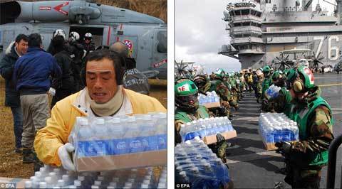 Trợ giúp: Hải quân Mỹ phân phát nước uống cho cư dân Nhật ở vùng Kuro-Soki. Trong khi đó, tàu sân bay USS Ronald Reagan ở ngoài khơi Nhật cung cấp viện trợ nhân đạo như một phần trong chiến dịch Tomodachi.